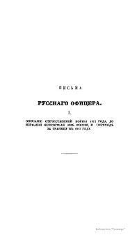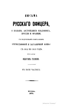 ПИСЬМА РУССКАГО ОФИЦЕРА, О ПОЛЬШѢ, АВСТРІЙСКИХЪ ВЛАДѢНІЯХЪ, ПРУССІИ И ФРАНЦІИ, СЪ ПОДРОБНЫМЪ ОПИСАНІЕМЪ ОТЕЧЕСТВЕННОЙ И ЗАГРАНИЧНОЙ ВОЙНЫ СЪ 1812 ПО 1815 ГОДЪ.