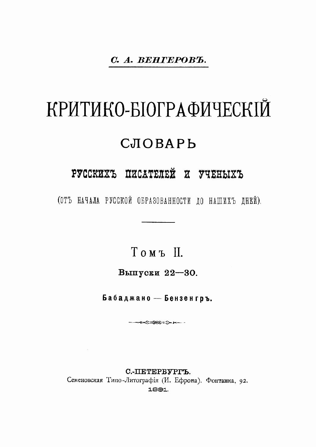 Критико-біографический словарь русскихъ писателей и ученыхъ. Томъ II. Выпуски 22–30. Бабаджано–Бензенгръ.