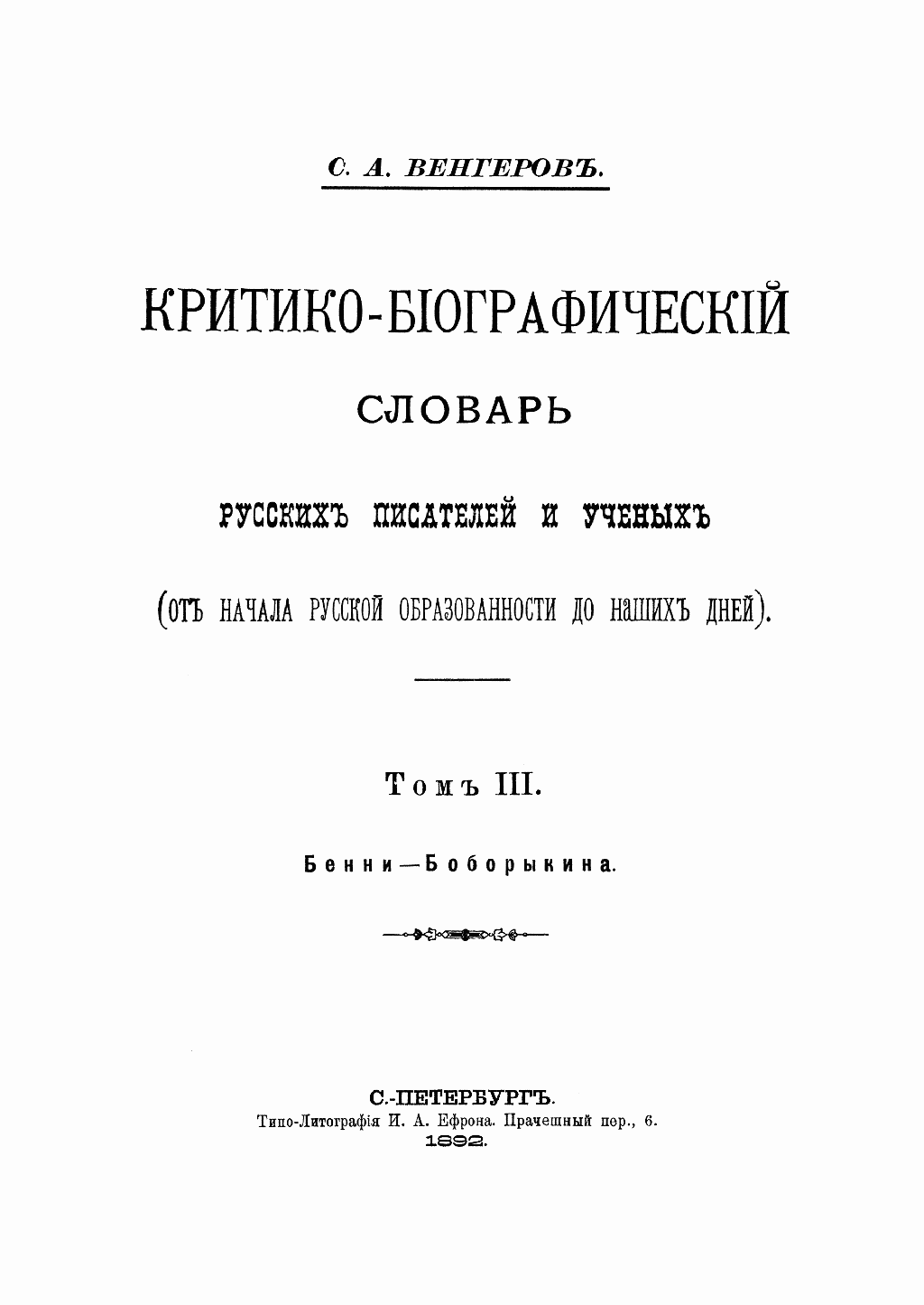 Критико-біографический словарь русскихъ писателей и ученыхъ. Томъ III. Бенни–Боборыкина.