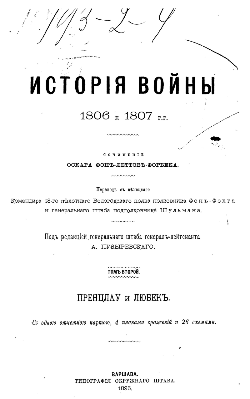 Перевод на русский язык фундаментального многотомного военно-исторического труда по истории войны русско-прусского союза с Наполеоном в 1806-1807 годах, написанного немецким военным историком Оскаром фон Леттов-Форбеком, был подготовлен при штабе Варшавского военного округа под руководством генерал-лейтенанта Генерального штаба, профессора военной истории академии Генерального штаба А.К. Пузыревского, получив при этом одобрение Военного министерства. Деятельность А.К. Пузыревского как одного из выдающихся военных педагогов и просветителей получила в России широкую известность. Представленное им исследование немецкого военного писателя, снабженное многочисленными картами и схемами боевых действий, сих пор представляет научный интерес. Одним из важнейших достоинств данного исследования является то, что автор широко использовал богатейший документальный массив как прусских, так и французских военных архивов, создав объективную картину одного из сложнейших этапов эпохи наполеоновских войн. Русско-прусско-французская война 1806-1807 гг. война между 4-й коалицией европейских держав (Великобритания, Россия, Пруссия, Саксония, Швеция) и наполеоновской Францией. Фактически эти две кампании являлась продолжением русско-австро-французской войны 1805 г. Не имея общего плана войны, союзники действовали несогласованно, что позволило Наполеону разбить их поочерёдно. Так 2 (14) октября 1806 г. в масштабном сражении под Йеной и Ауэрштадтом французская армия разгромила прусско-саксонские войска, после чего наполеоновские войска оккупировали большую часть Пруссии и 12 (24) октября заняли Берлин. Русская армия в составе трёх корпусов (около 160 тыс. чел.) под командованием генерал-фельдмаршала М. Ф. Каменского сосредоточилась в районе Пултуск, Остроленка, Брест-Литовск, выдвинув передовые отряды к Висле. 16 (28) ноября французские войска заняли Варшаву. Наполеон предпринял попытку окружить главные силы русских войск, но 14 (26) декабря в сражении под Пултуском русские войска сорвали этот план, нанеся поражение корпусу маршала Ж. Ланна. Затем русская армия отошла в район Тыкоцина, а наполеоновские войска расположились на зимние квартиры. 4 (16) января 1807 русская армия под командованием нового командующего генерал-адъютанта Л.Л. Беннигсена начала наступление из района Бялы в Восточную Пруссию с целью не допустить занятия французами Кенигсберга и Пиллау и нанести поражение изолированным корпусам Нея и Бернадота. Наполеон, узнав о продвижении русских войск, 20 января (1 февраля) направил главные силы на север, пытаясь обойти левый фланг русской армии и отрезать экспедиционные силы русских от России. Русские войска, ведя арьергардные бои, отошли к Прейсиш-Эйлау, где 26–27 января (7– 8 февраля) произошло встречное упорное сражение, в котором русские войска успешно отразили удары наполеоновской армии. 2 (14) июня 1807 г. в сражении под Фридландом русская армия, проявив чудеса героизма и мужества, вследствие неадекватных мер командования, была вынуждена отступить. В июне 1807 г. состоялось свидание Наполеона с императором Александром I в Тильзите и был подписан тяжёлый для России вынужденный союзный договор с наполеоновской Францией. Все эти военно-исторические события детально изложены в данном труде.