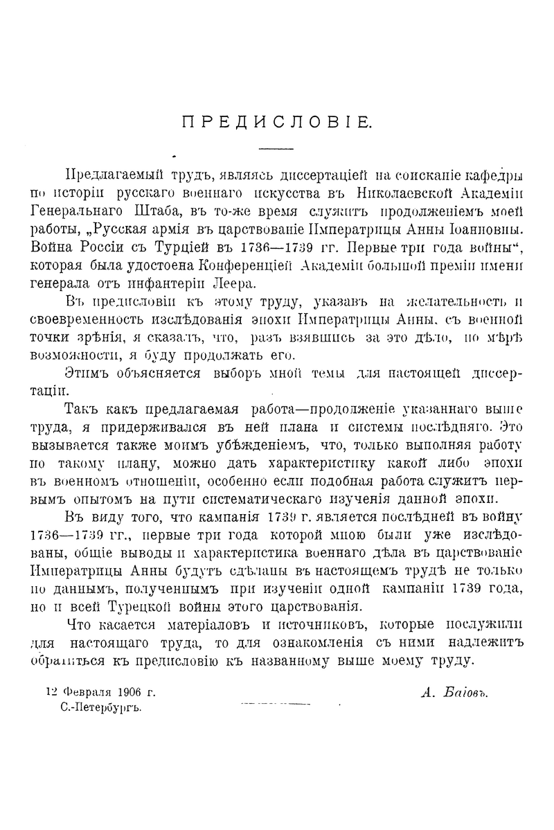 Масштабный военно-исторический труд видного военного историка и теоретика генерала А.К. Байова посвящено как политической истории, так и истории вооруженных сил России в «немецкое» десятилетие правления Анны Ивановны, является итогом его многолетних исследований. Автор в предисловии к данной книге справедливо замечает, что долгие годы тема русско-турецкой войны 1736-1739 гг. признавалась «малопоучительной». Тем выгоднее отличается представленный на рассмотрение в Академию Генерального штаба труд Байова, получивший законное признание и отмеченный большой премией Академии имени Леера. Труд основан на богатейшей документальной базе российских архивов, детально описывает деятельность русских войск в данной войне, вплоть до отдельных частей и соединений. Фундаментальный труд А.К. Байова до сих пор не утратил своей научной актуальности и значимости.