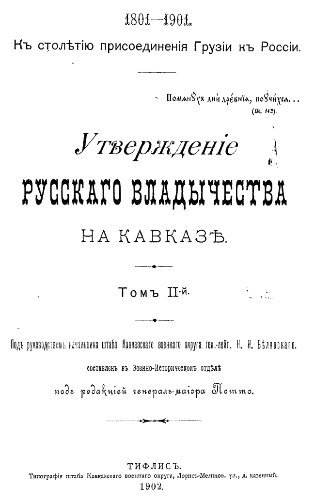 Фундаментальный исторический труд, содержащий историю кавказских войн, а также историю развития гражданского управления Кавказом.