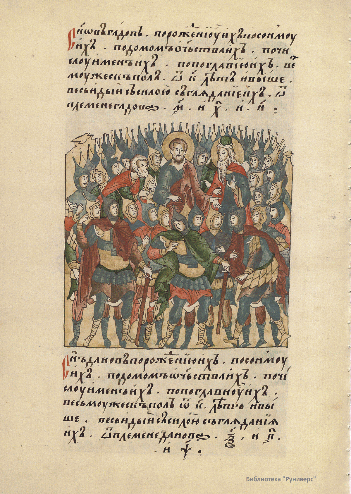 Лицевой летописный свод был создан во 2-й половине XVI века по распоряжению царя Иоанна IV Васильевича Грозного в единственном экземпляре для его детей. Над книгами Лицевого свода работали митрополичьи и «государевы» мастеровые: около 15 писцов и 10 художников. Свод состоит из около 10 тыс. листов и свыше 17 тыс. иллюстраций, причём изобразительный материал занимает около 2/3 всего объёма памятника. Рисунки-миниатюры (пейзажного, исторического, батального и бытового жанров) не только иллюстрируют текст, но и дополняют. Некоторые события не написаны, а только нарисованы. Рисунки рассказывают читателям как выглядели в древности одежда, воинские доспехи, церковные облачения, оружие, орудия труда, предметы обихода и проч.