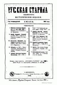 «Русская старина», ежемесячный исторический журнал, выходил в Петербурге в 1870-1918. Основан, издавался и редактировался (1870-1892) М. И. Семевским при участии В. И. Семевского. Последующими редакторами были Н. К. Шильдер (1892-1896), Н. Ф. Дубровин (1896-1904), военные историки С. П. Зыков, П. Н. Воронов.