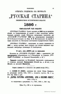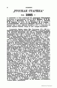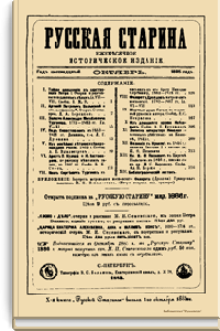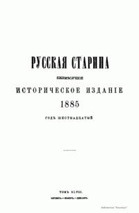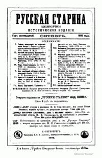 «Русская старина», ежемесячный исторический журнал, выходил в Петербурге в 1870-1918. Основан, издавался и редактировался (1870-1892) М. И. Семевским при участии В. И. Семевского. Последующими редакторами были Н. К. Шильдер (1892-1896), Н. Ф. Дубровин (1896-1904), военные историки С. П. Зыков, П. Н. Воронов.