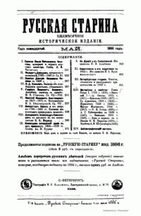 «Русская старина», ежемесячный исторический журнал, выходил в Петербурге в 1870-1918. Основан, издавался и редактировался (1870-1892) М. И. Семевским при участии В. И. Семевского. Последующими редакторами были Н. К. Шильдер (1892-1896), Н. Ф. Дубровин (1896-1904), военные историки С. П. Зыков, П. Н. Воронов.