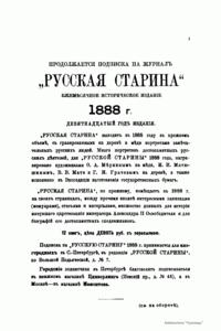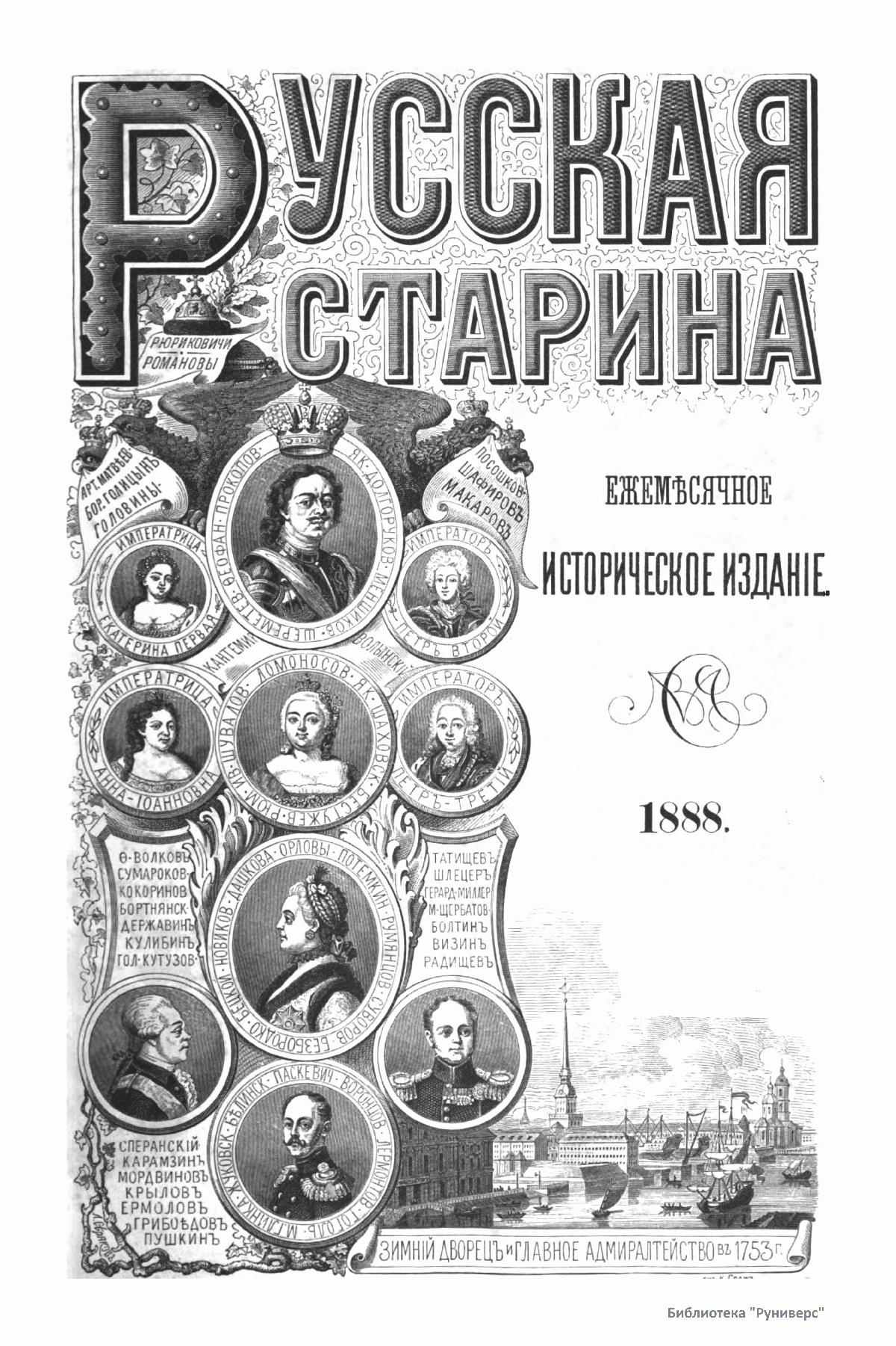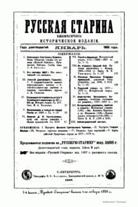 «Русская старина», ежемесячный исторический журнал, выходил в Петербурге в 1870-1918. Основан, издавался и редактировался (1870-1892) М. И. Семевским при участии В. И. Семевского. Последующими редакторами были Н. К. Шильдер (1892-1896), Н. Ф. Дубровин (1896-1904), военные историки С. П. Зыков, П. Н. Воронов.