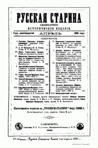 «Русская старина», ежемесячный исторический журнал, выходил в Петербурге в 1870-1918. Основан, издавался и редактировался (1870-1892) М. И. Семевским при участии В. И. Семевского. Последующими редакторами были Н. К. Шильдер (1892-1896), Н. Ф. Дубровин (1896-1904), военные историки С. П. Зыков, П. Н. Воронов.