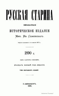 «Русская старина», ежемесячный исторический журнал, выходил в Петербурге в 1870-1918. Основан, издавался и редактировался (1870-1892) М. И. Семевским при участии В. И. Семевского. Последующими редакторами были Н. К. Шильдер (1892-1896), Н. Ф. Дубровин (1896-1904), военные историки С. П. Зыков, П. Н. Воронов.