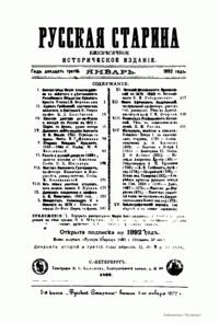 «Русская старина», ежемесячный исторический журнал, выходил в Петербурге в 1870-1918. Основан, издавался и редактировался (1870-1892) М. И. Семевским при участии В. И. Семевского. Последующими редакторами были Н. К. Шильдер (1892-1896), Н. Ф. Дубровин (1896-1904), военные историки С. П. Зыков, П. Н. Воронов.