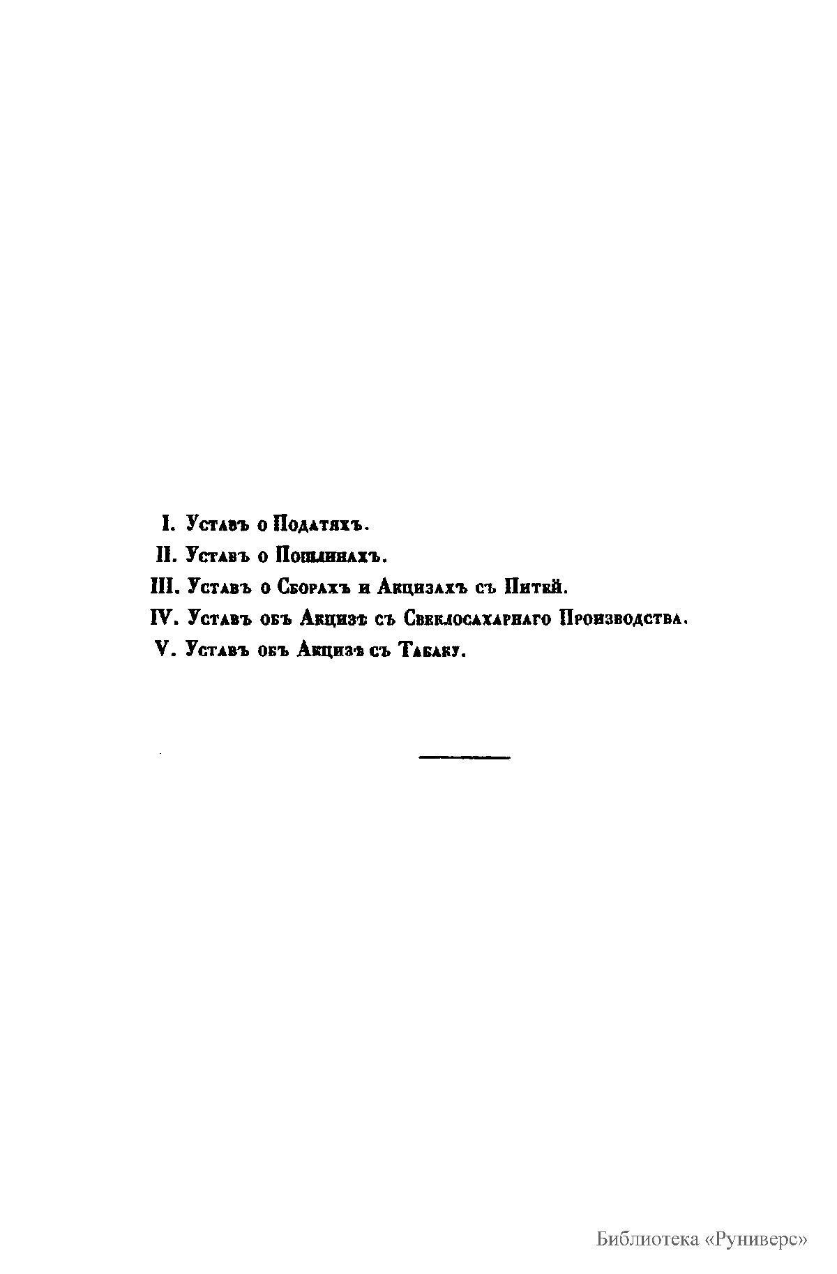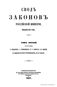 Сводъ законовъ Россiйской имперiи. Томъ пятый. Уставы о податяхъ, о пошлинахъ, и о сборахъ съ питей, с свеклосахарнаго производства, и съ табаку