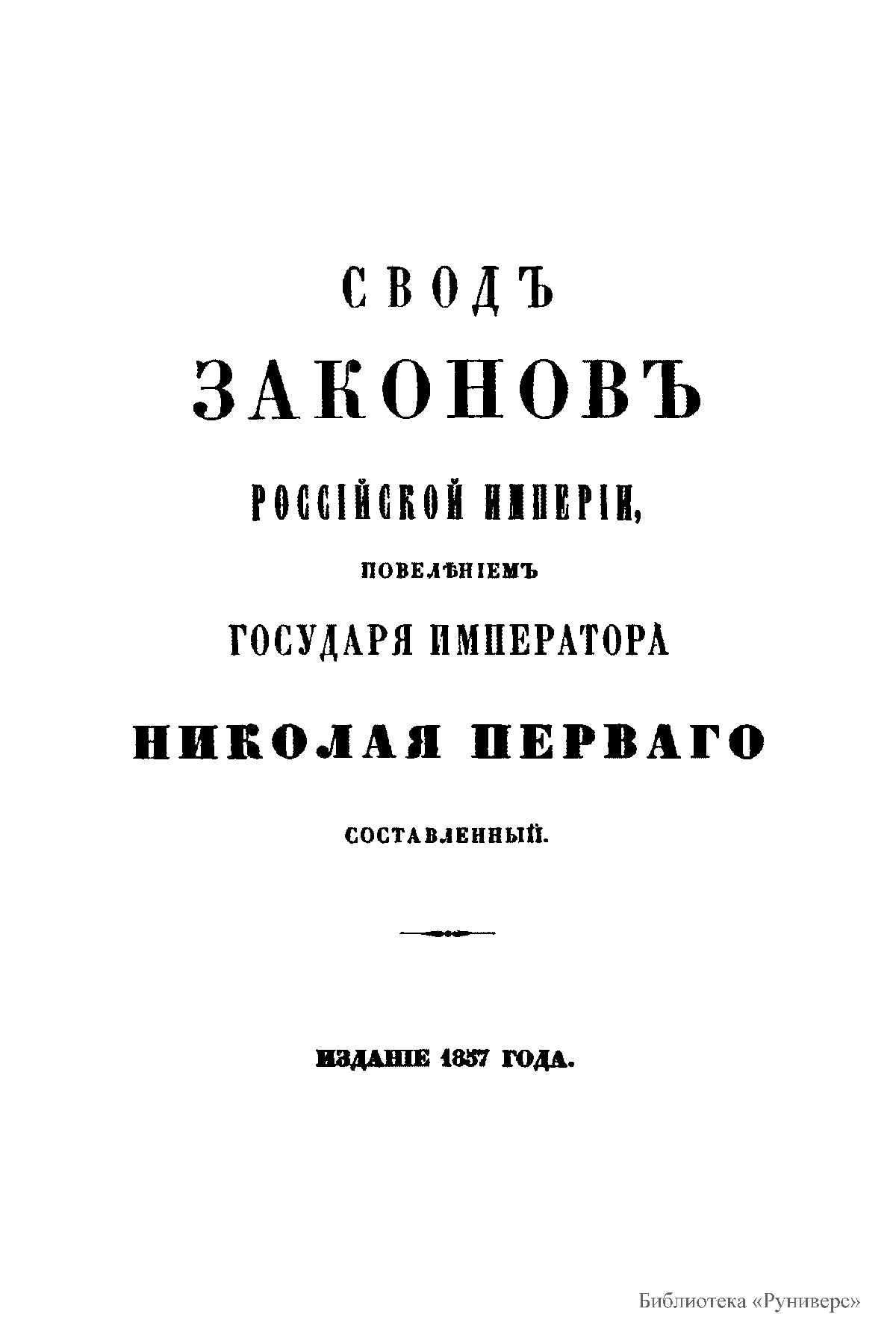 Свод законов Российской империи— официальное собрание расположенных в тематическом порядке действующих законодательных актов Российской империи, созданное при Николае I. Впервые он был напечатан в 1832 году. Манифестом 31 января 1833 года Свод законов был объявлен действующим источником права с 1 января 1835 года. Первое издание 1832 года и последующие 1842-го и 1857 года состояли из пятнадцати томов. После 1857 года Свод законов полностью не переиздавался, а выходили лишь отдельные тома. В качестве отдельного – 16-го тома в 1885 году вышли Судебные уставы. Между изданиями Свода законов выходили ежегодные и сводные (за несколько лет) «Продолжения» Свода законов с указанием на упраздненные и измененные статьи. В своде законов собраны все реально действовавшие в определенный момент времени законы по тем или иным проблемам права, это справочник для юристов. Отбор законодательного материала для включения в Свод производился на основе Полного собрания законов (первое Полное собрание законов, появившееся в 1830 году, состояло из 45 томов, содержащих 30 920 актов и 6 томов приложений). Собрание законов – это в большой степени историческое издание. По нему можно изучать развитие, направление правительственной мысли в стране. Это летопись отечественного законотворчества. Изучая страницу за страницей эту летопись, мы можем узнать, что в тот или иной момент истории являлось злобой дня.