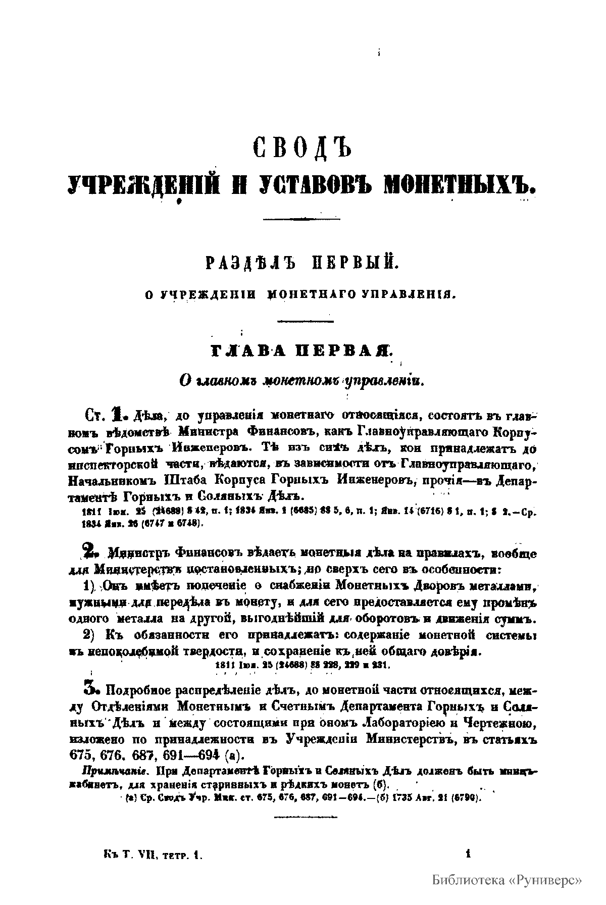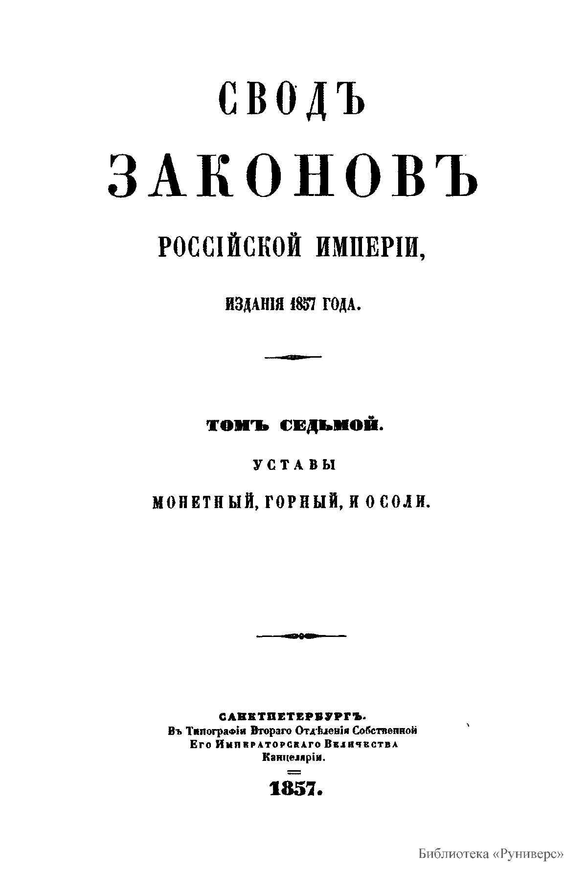 Сводъ законовъ Россiйской имперiи. Томъ седьмой. Уставы монетный, горный, и о соли