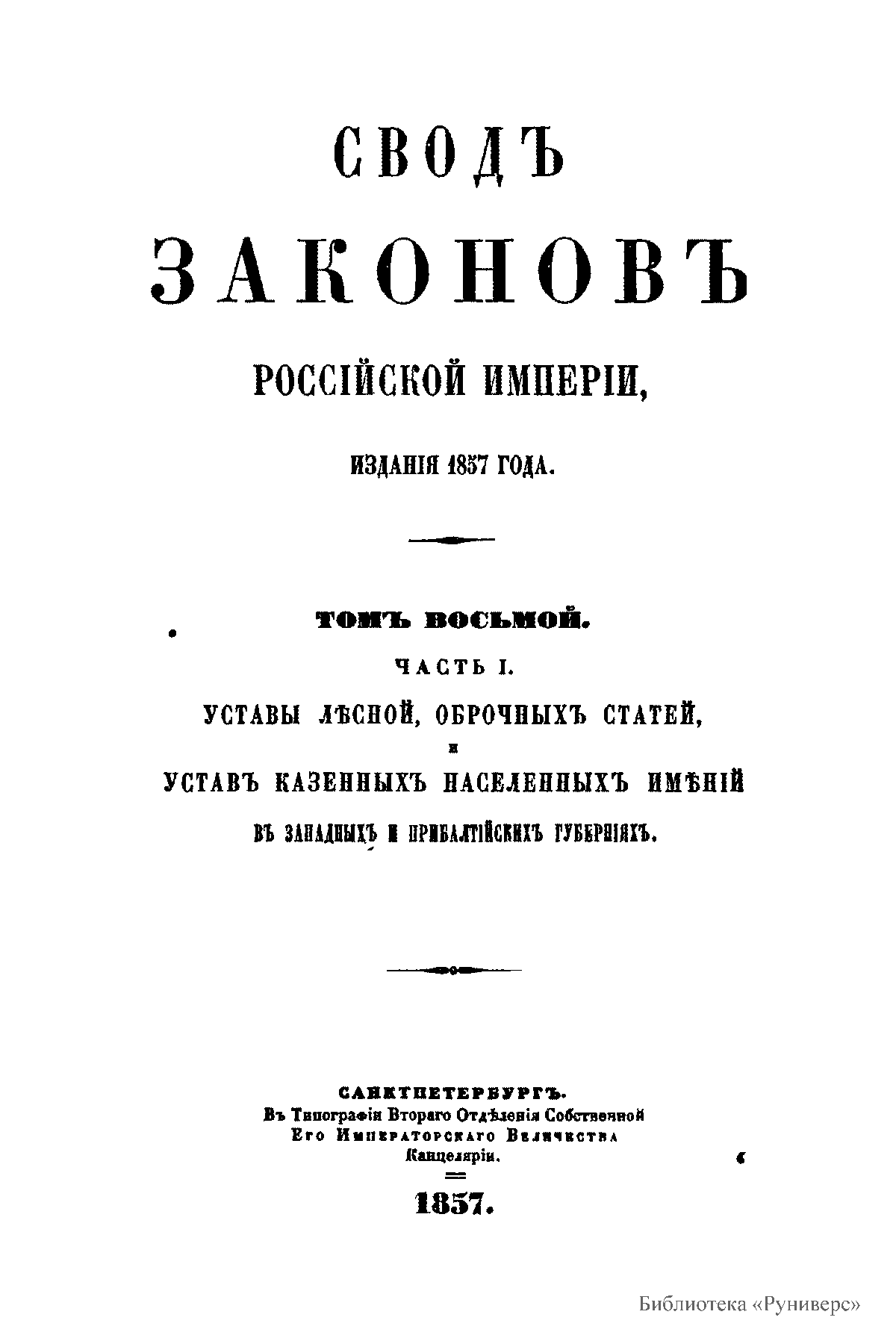 Сводъ законовъ Россiйской имперiи. Томъ восьмой. Часть I. Уставы лѣсной, оброчныхъ статей, и уставъ казенныхъ населенныхъ имѣній въ западныхъ и прибалтійскихъ губерніяхъ