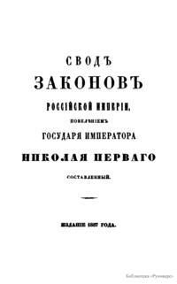 Свод законов Российской империи— официальное собрание расположенных в тематическом порядке действующих законодательных актов Российской империи, созданное при Николае I. Впервые он был напечатан в 1832 году. Манифестом 31 января 1833 года Свод законов был объявлен действующим источником права с 1 января 1835 года. Первое издание 1832 года и последующие 1842-го и 1857 года состояли из пятнадцати томов. После 1857 года Свод законов полностью не переиздавался, а выходили лишь отдельные тома. В качестве отдельного – 16-го тома в 1885 году вышли Судебные уставы. Между изданиями Свода законов выходили ежегодные и сводные (за несколько лет) «Продолжения» Свода законов с указанием на упраздненные и измененные статьи. В своде законов собраны все реально действовавшие в определенный момент времени законы по тем или иным проблемам права, это справочник для юристов. Отбор законодательного материала для включения в Свод производился на основе Полного собрания законов (первое Полное собрание законов, появившееся в 1830 году, состояло из 45 томов, содержащих 30 920 актов и 6 томов приложений). Собрание законов – это в большой степени историческое издание. По нему можно изучать развитие, направление правительственной мысли в стране. Это летопись отечественного законотворчества. Изучая страницу за страницей эту летопись, мы можем узнать, что в тот или иной момент истории являлось злобой дня.