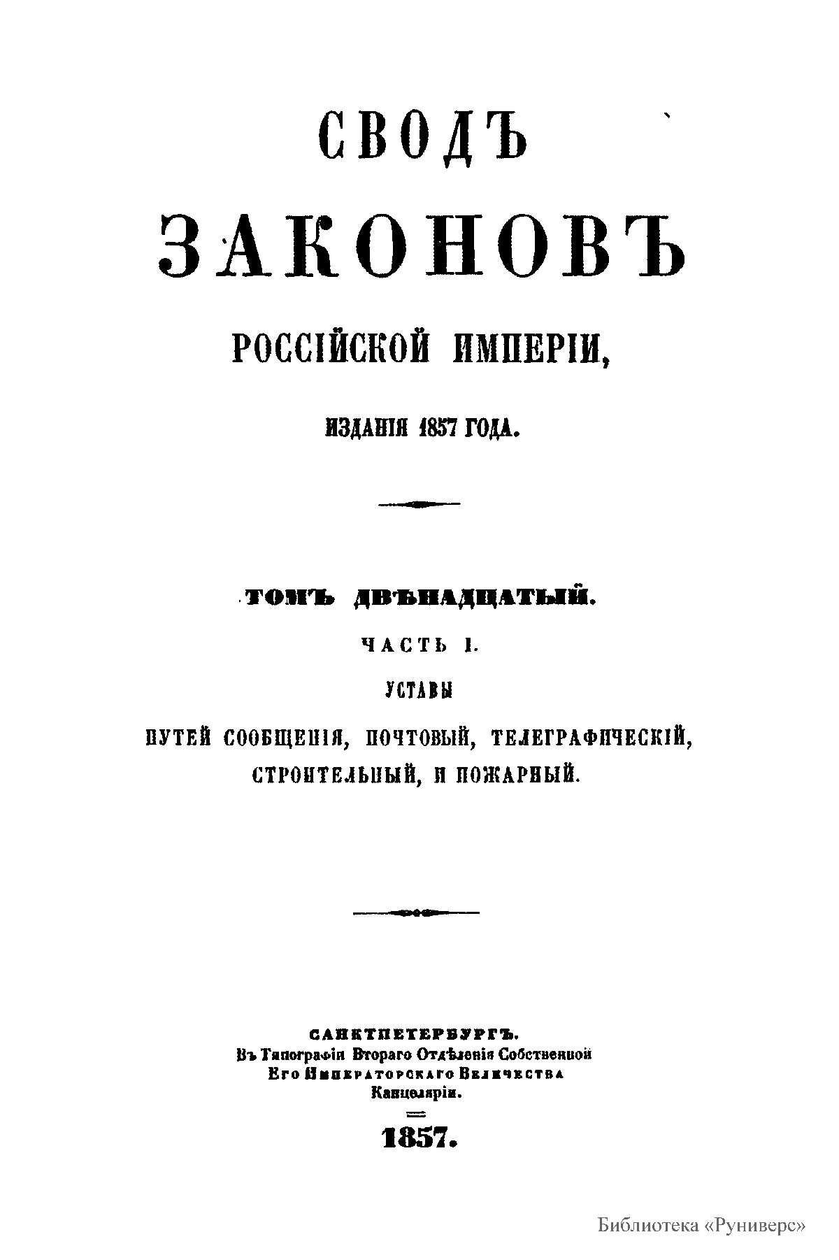 Сводъ законовъ Россiйской имперiи. Томъ двѣнадцатый. Часть I. Уставы путей сообщенiя, почтовый, телеграфическiй, строительный, и пожарный