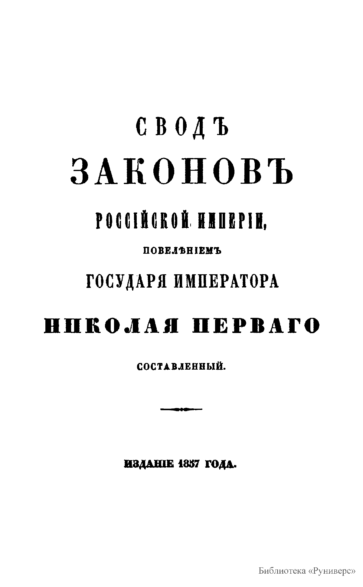 Свод законов Российской империи— официальное собрание расположенных в тематическом порядке действующих законодательных актов Российской империи, созданное при Николае I. Впервые он был напечатан в 1832 году. Манифестом 31 января 1833 года Свод законов был объявлен действующим источником права с 1 января 1835 года. Первое издание 1832 года и последующие 1842-го и 1857 года состояли из пятнадцати томов. После 1857 года Свод законов полностью не переиздавался, а выходили лишь отдельные тома. В качестве отдельного – 16-го тома в 1885 году вышли Судебные уставы. Между изданиями Свода законов выходили ежегодные и сводные (за несколько лет) «Продолжения» Свода законов с указанием на упраздненные и измененные статьи. В своде законов собраны все реально действовавшие в определенный момент времени законы по тем или иным проблемам права, это справочник для юристов. Отбор законодательного материала для включения в Свод производился на основе Полного собрания законов (первое Полное собрание законов, появившееся в 1830 году, состояло из 45 томов, содержащих 30 920 актов и 6 томов приложений). Собрание законов – это в большой степени историческое издание. По нему можно изучать развитие, направление правительственной мысли в стране. Это летопись отечественного законотворчества. Изучая страницу за страницей эту летопись, мы можем узнать, что в тот или иной момент истории являлось злобой дня.