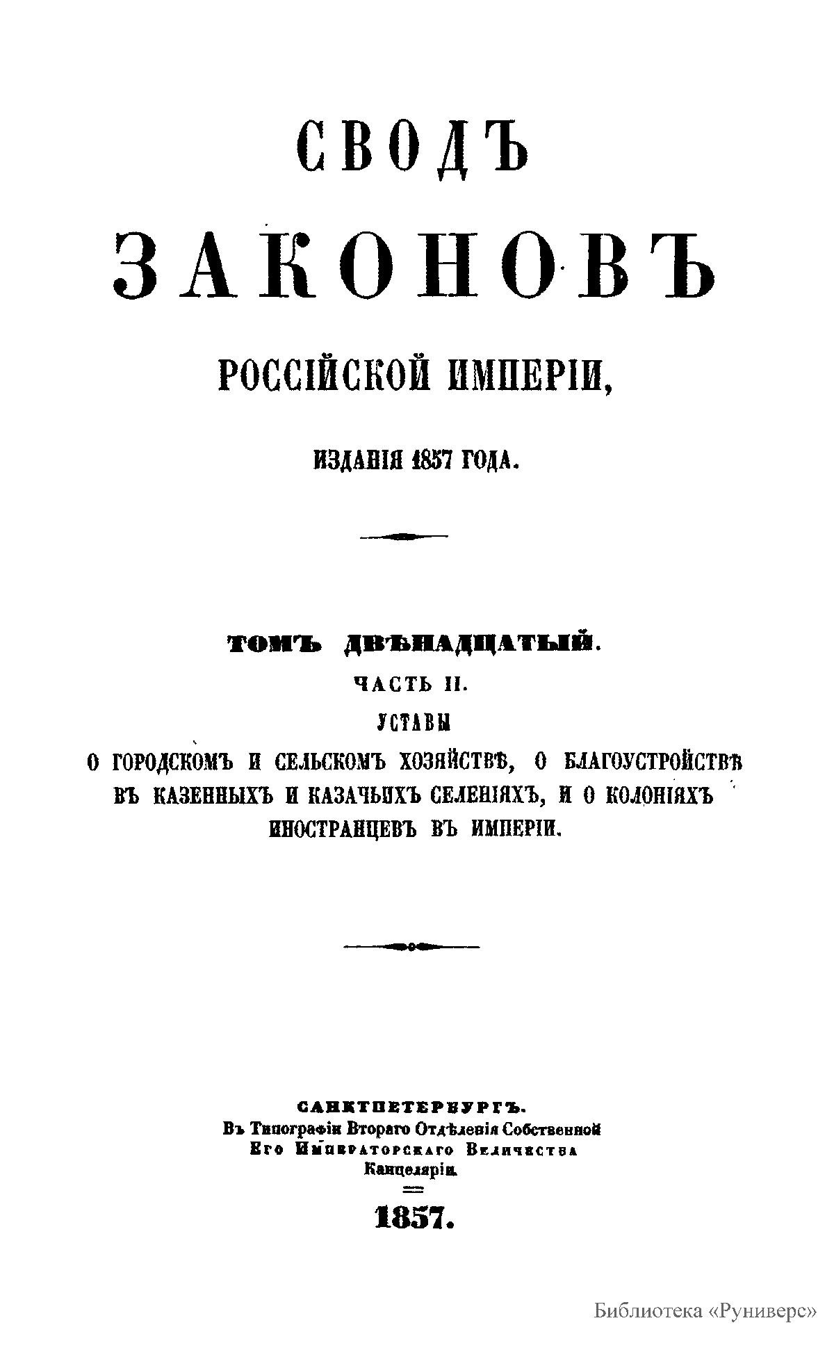 Сводъ законовъ Россiйской имперiи. Томъ двѣнадцатый. Часть II. Уставы о городскомъ и сельскомъ хозяйствѣ, о благоустройствѣ въ казенныхъ и казачьихъ селенiяхъ, и о колонiяхъ иностранцевъ въ имперiи
