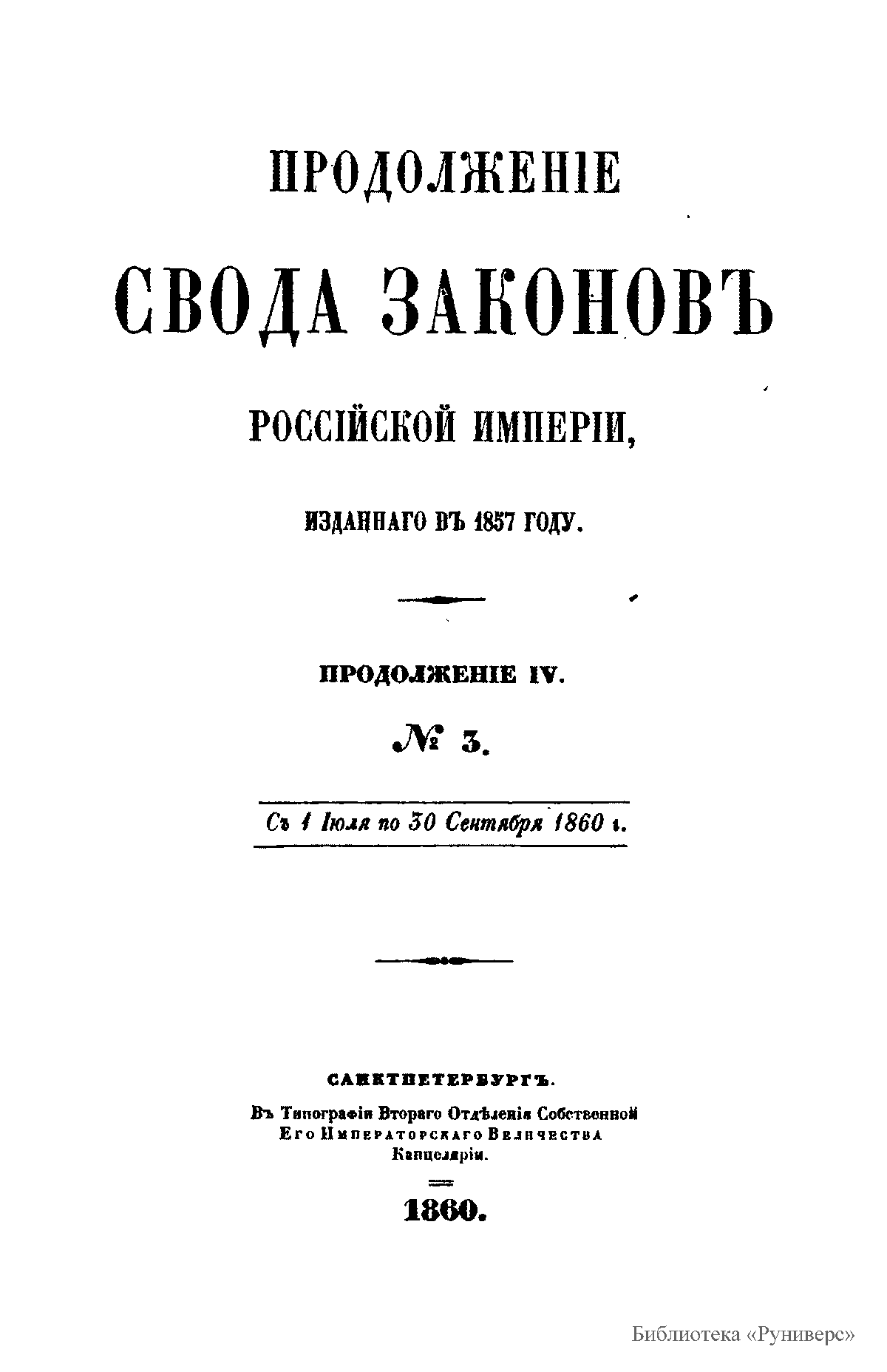 Продолжение свода законов Российской империи, изданного в 1857 году. Продолжение №IV. №3. С 1 июля по 31 сентября 1860 года