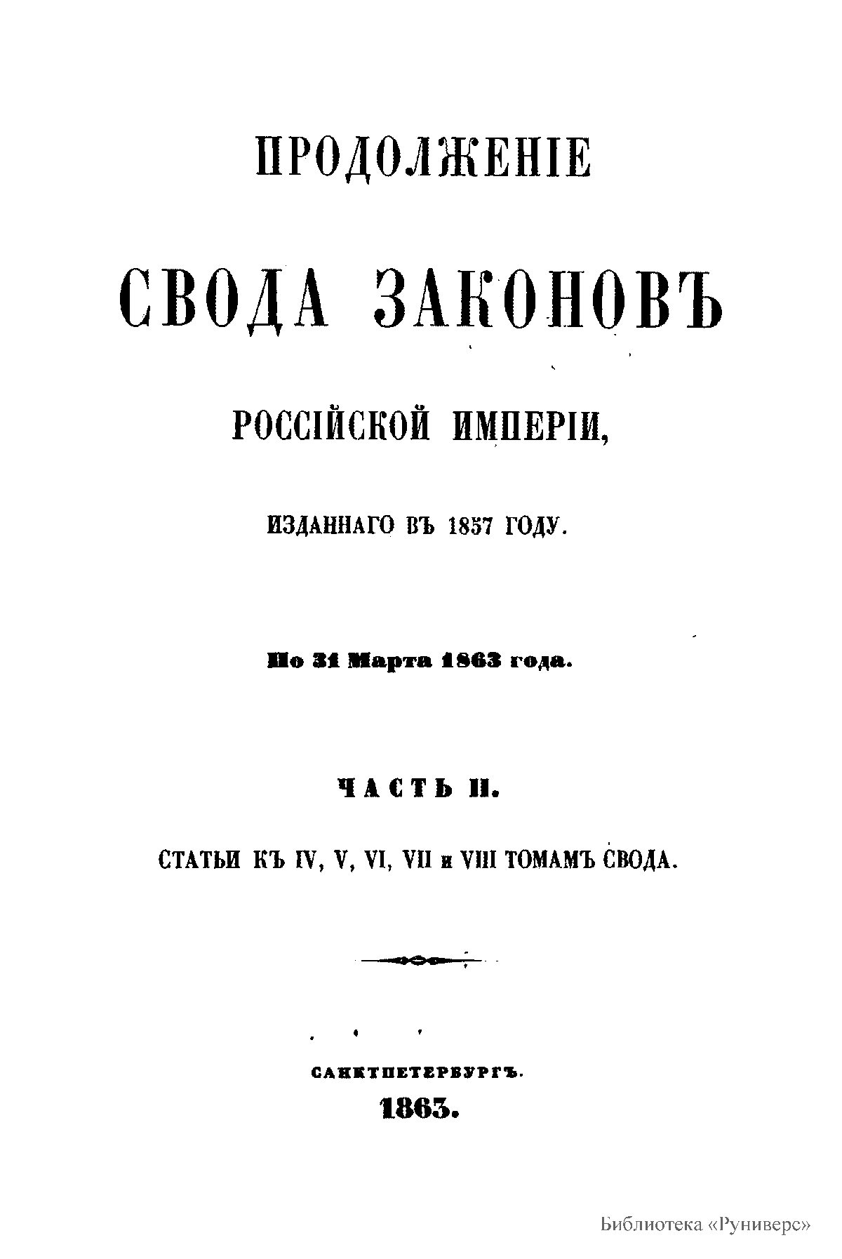 Продолженiе свода законовъ Россiйской имперiи, изданнаго въ 1857 году. По 31 марта 1863 года. Часть II. Статьи къ IV, V, VII, VIII томамъ свода