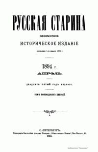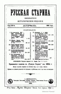 «Русская старина», ежемесячный исторический журнал, выходил в Петербурге в 1870-1918. Основан, издавался и редактировался (1870-1892) М. И. Семевским при участии В. И. Семевского. Последующими редакторами были Н. К. Шильдер (1892-1896), Н. Ф. Дубровин (1896-1904), военные историки С. П. Зыков, П. Н. Воронов.