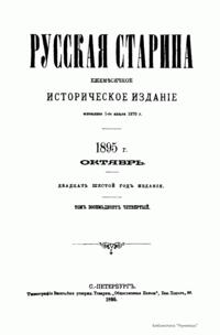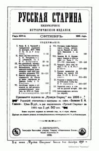 «Русская старина», ежемесячный исторический журнал, выходил в Петербурге в 1870-1918. Основан, издавался и редактировался (1870-1892) М. И. Семевским при участии В. И. Семевского. Последующими редакторами были Н. К. Шильдер (1892-1896), Н. Ф. Дубровин (1896-1904), военные историки С. П. Зыков, П. Н. Воронов.