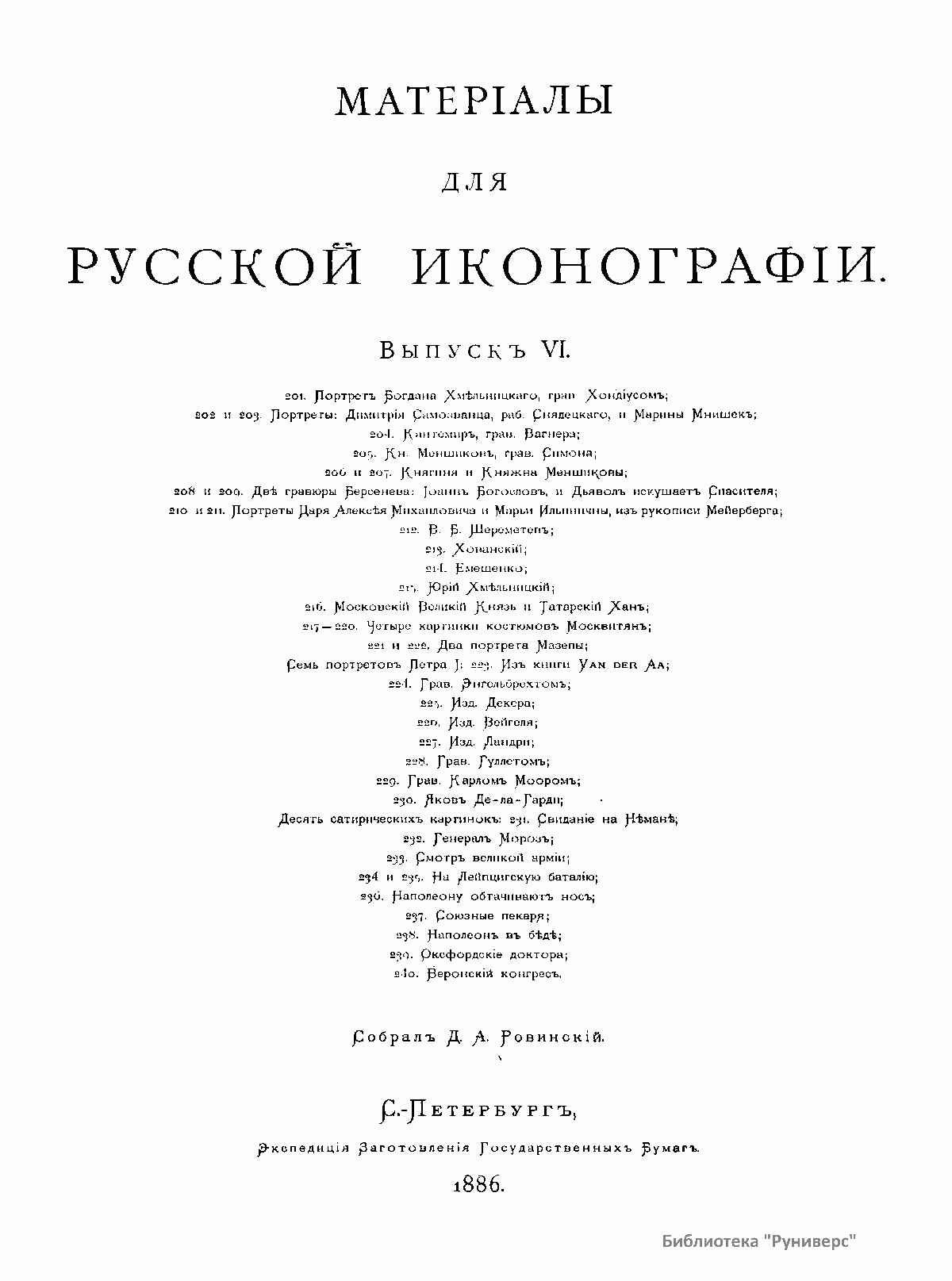 В 1882 г. Д. Ровинский издал книгу «Достоверные портреты московских государей: Ивана III, Василия Ивановича и Ивана IV Грозного – и посольства их времени». Это исследование составляло первый отдел предпринятой автором русской иконографии. За ним должны были следовать другие отделы. Материалов для каждого из этих отделов накопилось довольно много, но тем не менее существовали еще значительные пробелы, которые не позволяли приступить к систематическому изданию. Но так как любители и собиратели старины настаивали на издании, автор приступил к предварительной публикации собранных им снимков под общим названием «Материалы для русской иконографии». В эти материалы вошли портреты, виды, исторические и бытовые листы, листы, изготовленные для истории русской гравюры, работы граверов-серебряников, а также отпечатки с оригинальных старинных медных досок. Все снимки, за немногим исключением, сделаны в одну меру с оригиналами. Самые замечательные и редкие исполнены на меди по способу Г. Скамони, или печатаны со стекла посредством альбертотипии (у Шера и Набгольца в Москве и за границей) и фотогиалотипии (у г. Скамони); менее редкие и важные картинки исполнены посредством фотолитографии.