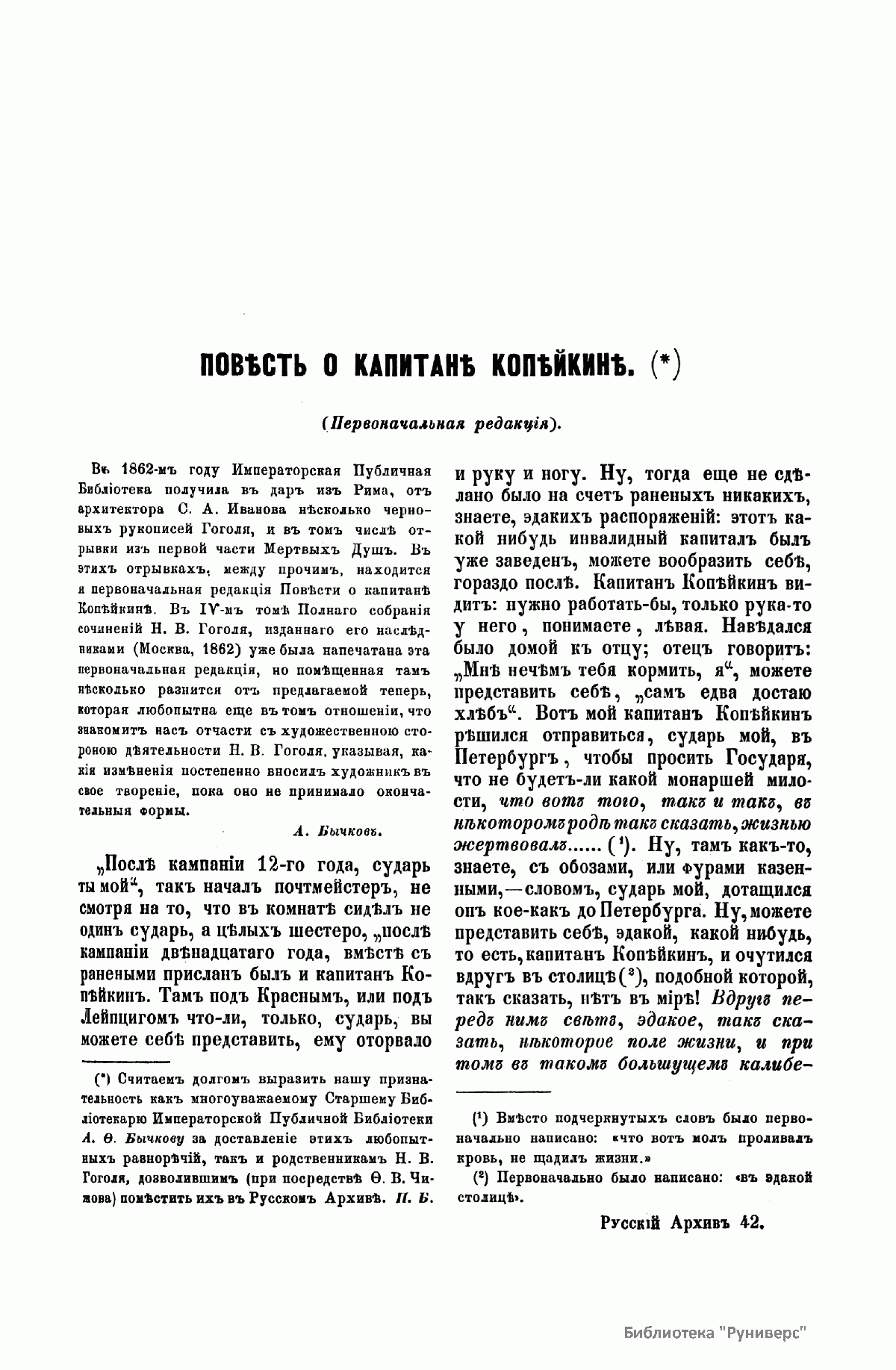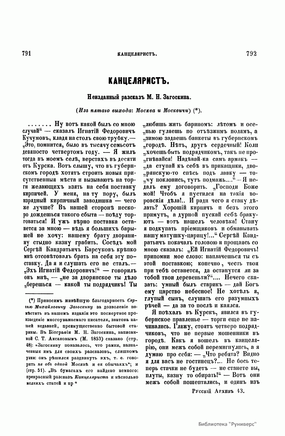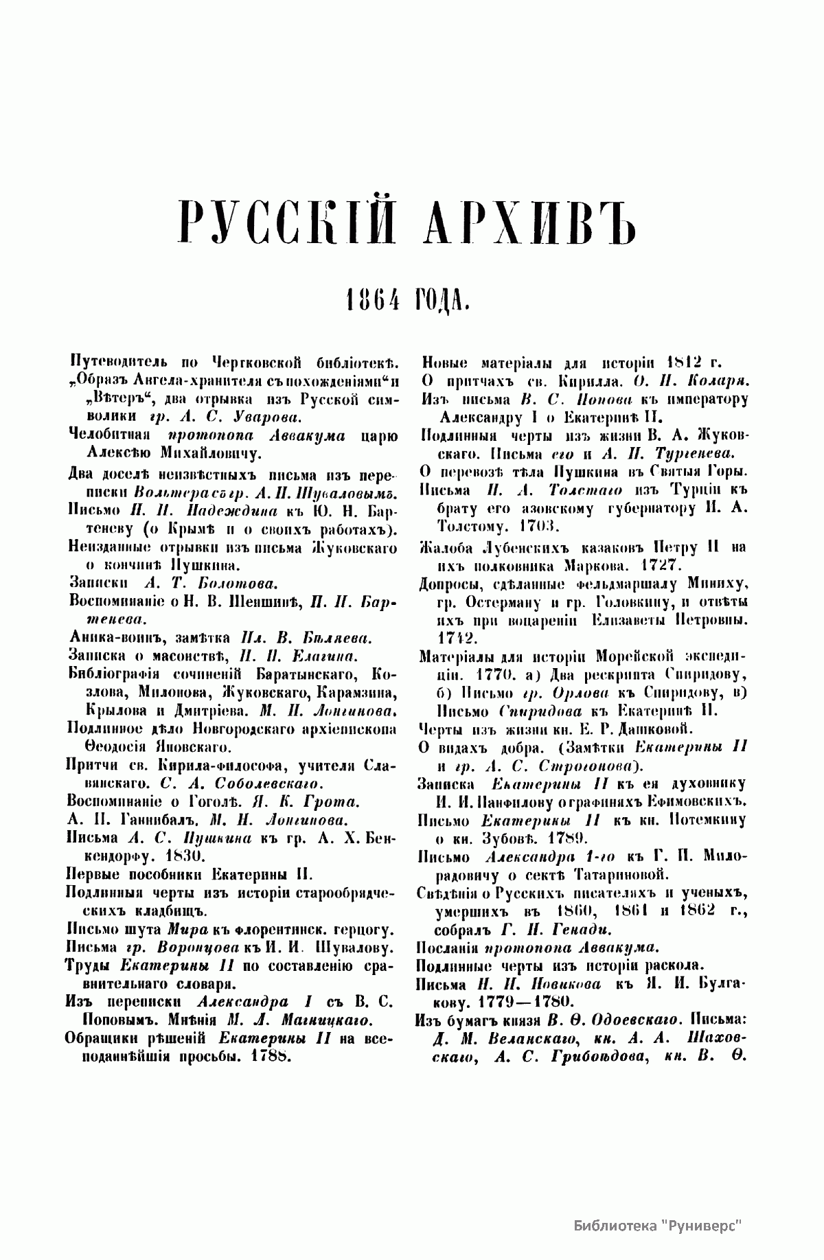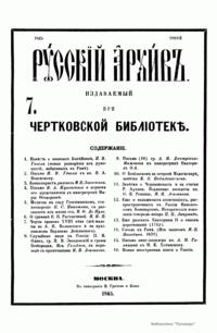 «Русский архив» — ежемесячный историко-литературный журнал, издававшийся в Москве с 1863 по 1917 год. Создателем и продолжительные годы редактором журнала был П. И. Бартенев – историк, археограф, библиограф. Этот журнал называли «живой картиной былого», поскольку он содержал преимущественно публикации неизданных мемуарных, эпистолярных, литературно-художественных и ведомственных документальных материалов, освещавших культурную и политическую историю России в XVIII и XIX вв. По числу опубликованных источников «Русский архив» стоит на первом месте среди русских исторических журналов.