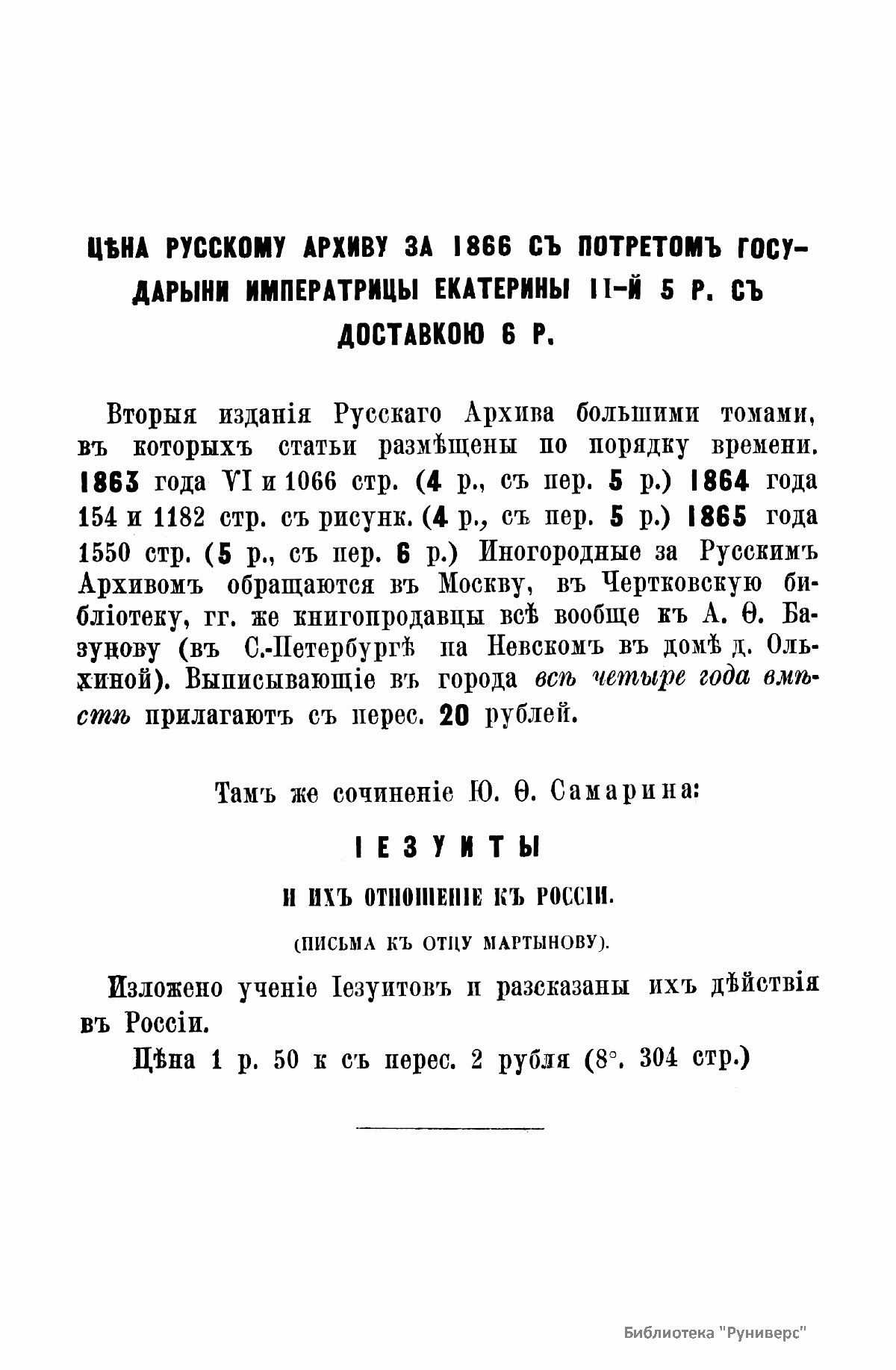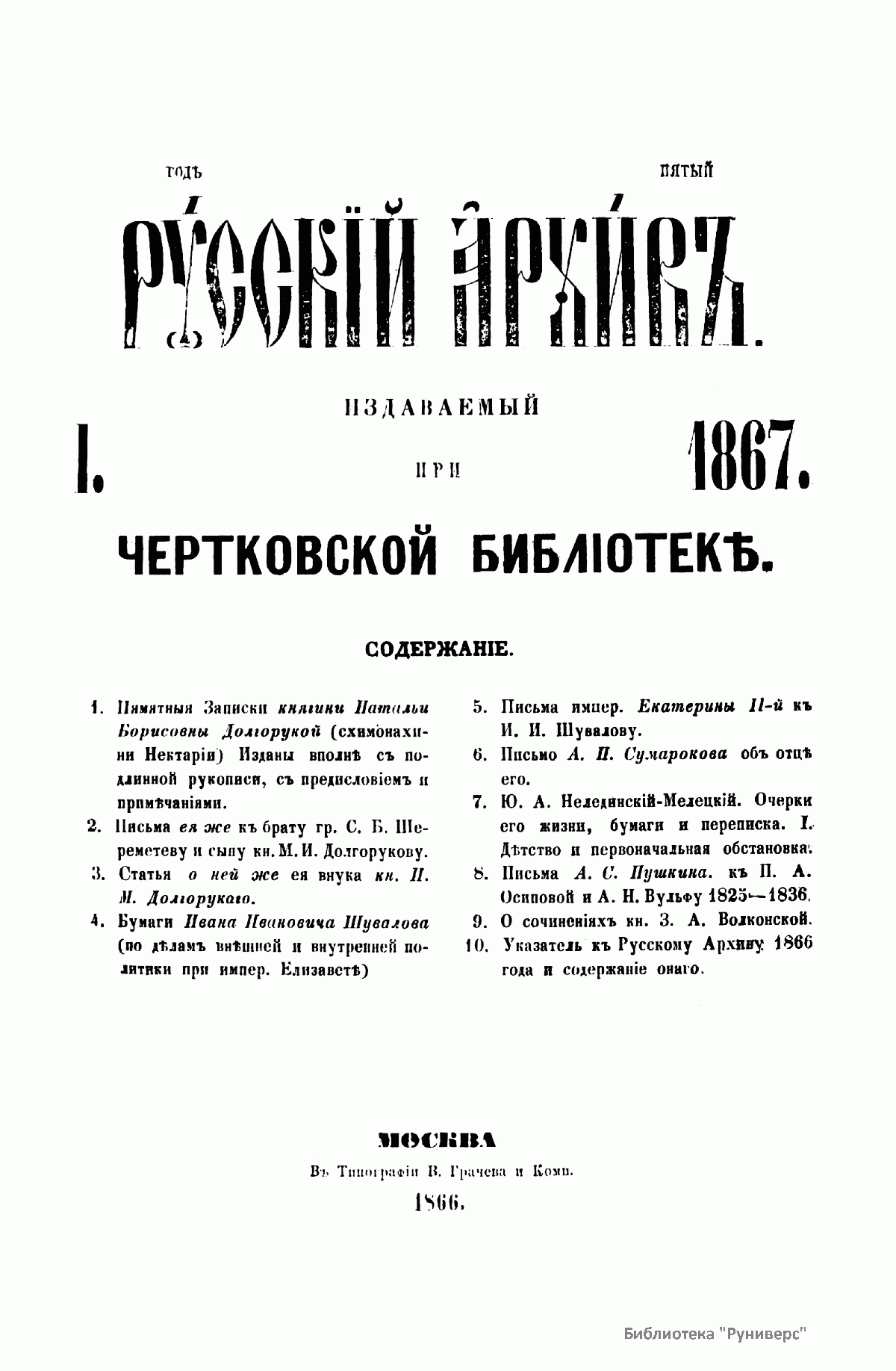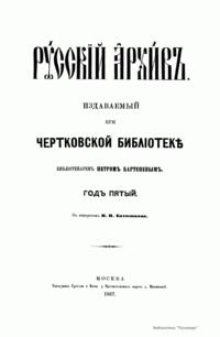 «Русский архив» — ежемесячный историко-литературный журнал, издававшийся в Москве с 1863 по 1917 год. Создателем и продолжительные годы редактором журнала был П. И. Бартенев – историк, археограф, библиограф. Этот журнал называли «живой картиной былого», поскольку он содержал преимущественно публикации неизданных мемуарных, эпистолярных, литературно-художественных и ведомственных документальных материалов, освещавших культурную и политическую историю России в XVIII и XIX вв. По числу опубликованных источников «Русский архив» стоит на первом месте среди русских исторических журналов.