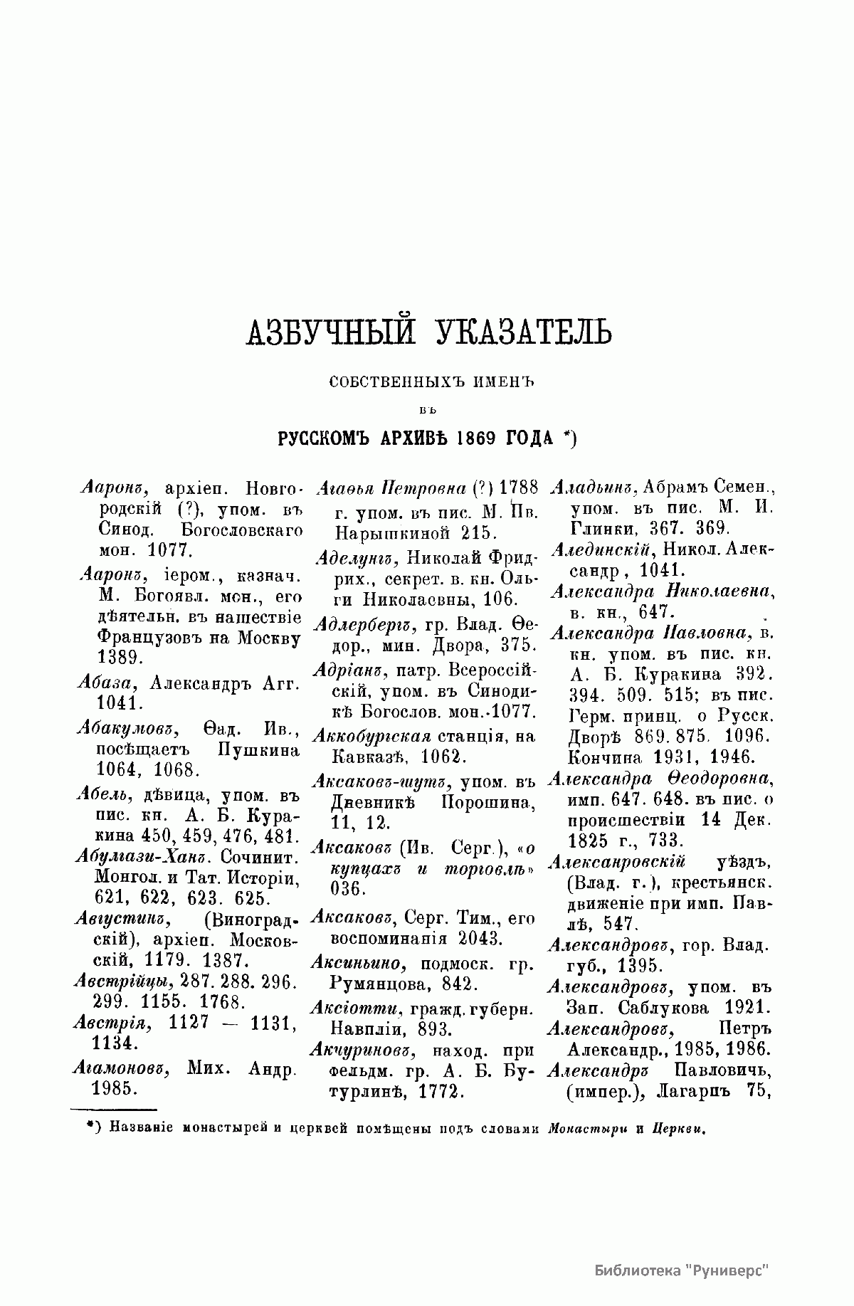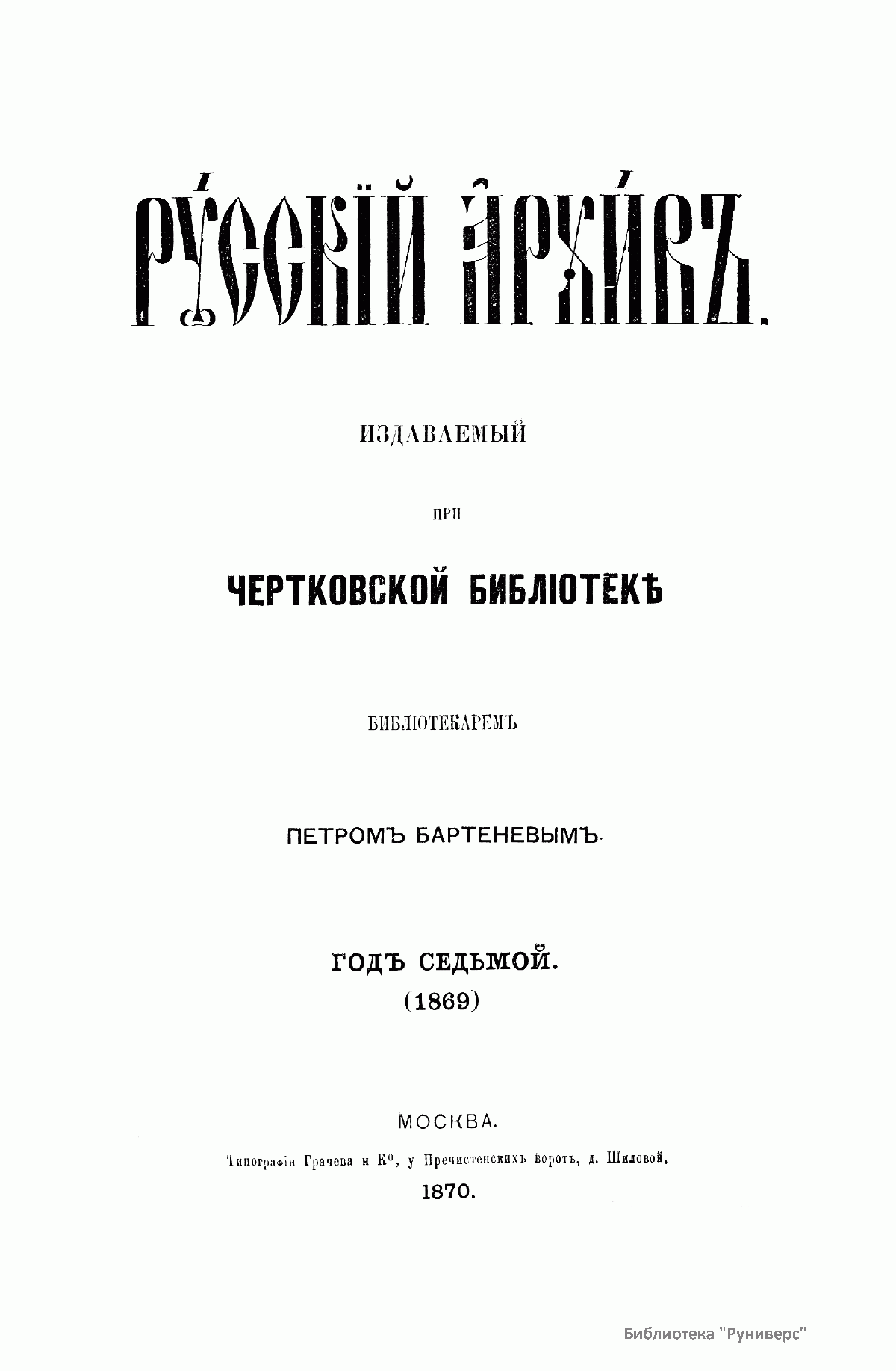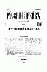 «Русский архив» — ежемесячный историко-литературный журнал, издававшийся в Москве с 1863 по 1917 год. Создателем и продолжительные годы редактором журнала был П. И. Бартенев – историк, археограф, библиограф. Этот журнал называли «живой картиной былого», поскольку он содержал преимущественно публикации неизданных мемуарных, эпистолярных, литературно-художественных и ведомственных документальных материалов, освещавших культурную и политическую историю России в XVIII и XIX вв. По числу опубликованных источников «Русский архив» стоит на первом месте среди русских исторических журналов.