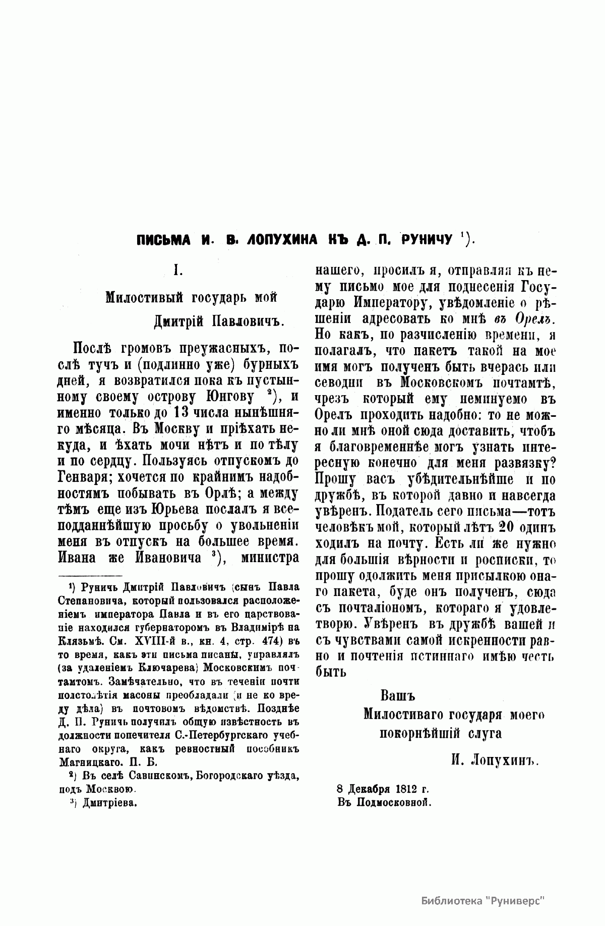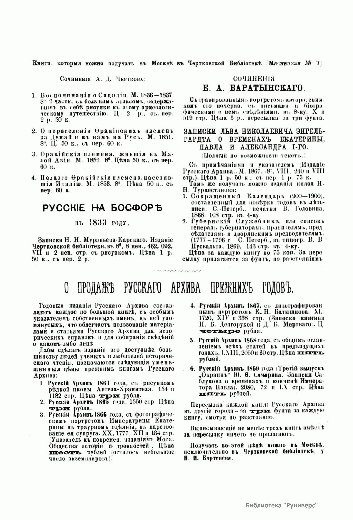 «Русский архив» — ежемесячный историко-литературный журнал, издававшийся в Москве с 1863 по 1917 год. Создателем и продолжительные годы редактором журнала был П. И. Бартенев – историк, археограф, библиограф. Этот журнал называли «живой картиной былого», поскольку он содержал преимущественно публикации неизданных мемуарных, эпистолярных, литературно-художественных и ведомственных документальных материалов, освещавших культурную и политическую историю России в XVIII и XIX вв. По числу опубликованных источников «Русский архив» стоит на первом месте среди русских исторических журналов.