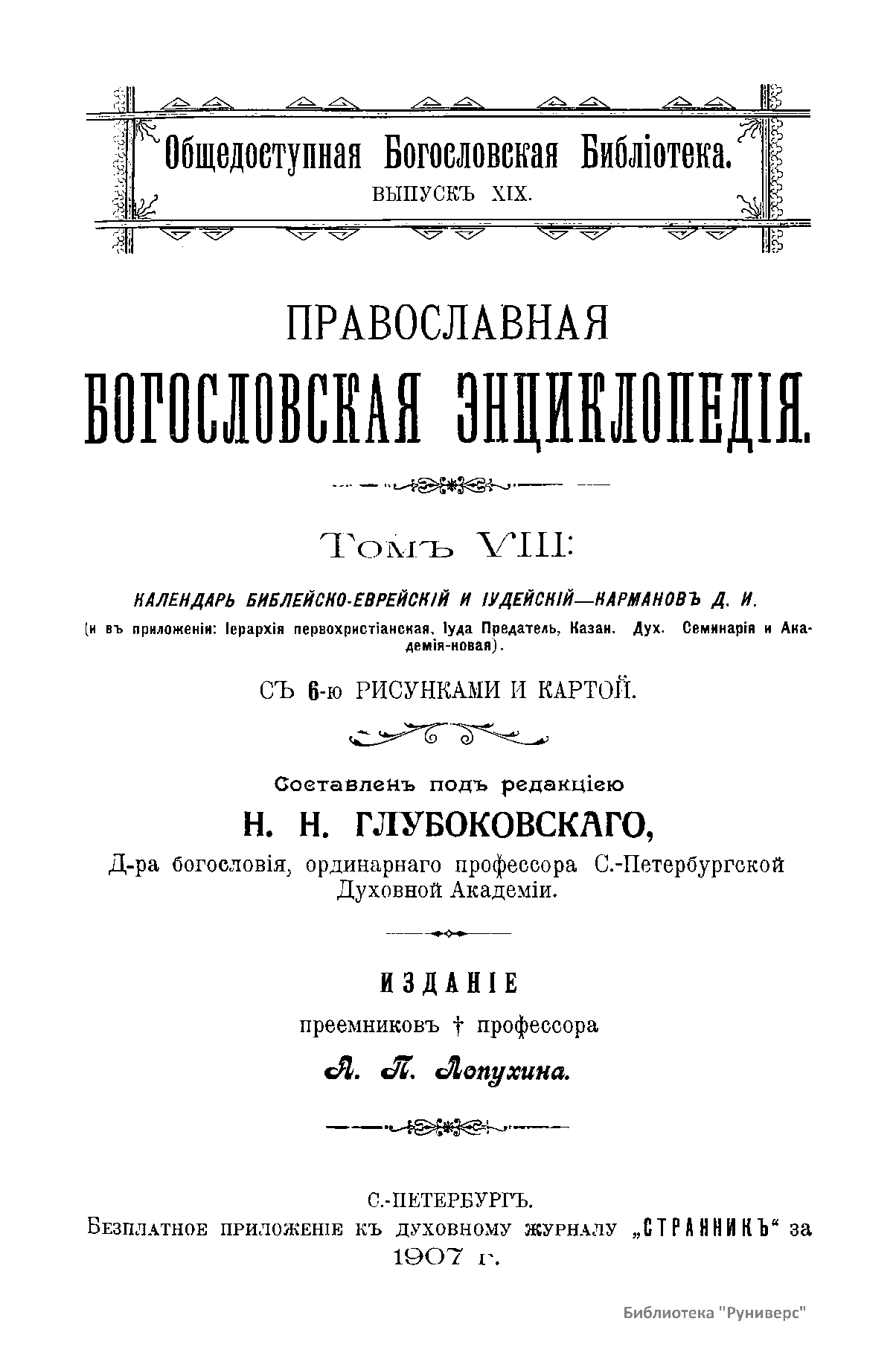 Православная богословская энциклопедiя. Томъ VIII. Календарь Библейско-Еврейскiй и Иудейскiй - Кармановъ Д.И.