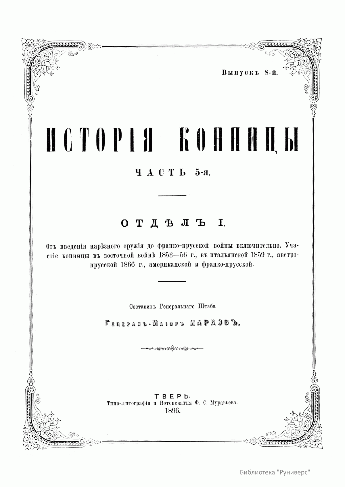 Труд по истории конницы М. И. Маркова, командира 1-го лейб-драгунского Московского его величества полка, изданный в конце XIX века в пяти томах, сегодня признан безусловной библиографической редкостью. Капитальная монография, уникальная по объему собранного материала, написана занимательным, живым языком. Издание охватывает обширный и разнообразный по своему составу материал. Изучение конницы ведется со времен ее возникновения в Древней Греции; затем рассмотрено дальнейшее развитие конных войск в Римской империи, в средневековых государствах Европы и Азии. Особенно пристальное внимание автор уделил кавалерии России от ее возникновения до детального разбора действий русской конницы во время Балканской войны 1877–1878 гг. На страницах монографии рассмотрено огромное количество сражений и битв различных государств и эпох, приведены выводы автора об устройстве конницы минувших столетий. Текст сопровождают многочисленные иллюстрации, изображающие породы и окрасы лошадей, формы обмундирования и вооружения всадников, портреты знаменитых полководцев и государственных деятелей, а также схемы и карты сражений.