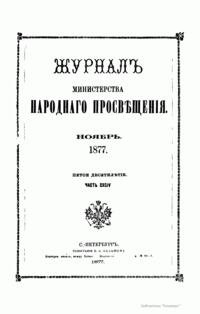 Журнал Министерства народного просвещения выходил с 1834-го по 1917 год. Официальный периодический журнал об успехах просвещения в России. Издатели журнала уверены в том, что «если для каждого человека необходим выход из грубой тьмы невежества и беспрерывное дальнейшее движение к свету, то для народов необходимо попечительное участие правительства в образовании. Только правительство имеет все средства знать и высоту успехов всемирного образования, и настоящие нужды Отечества».