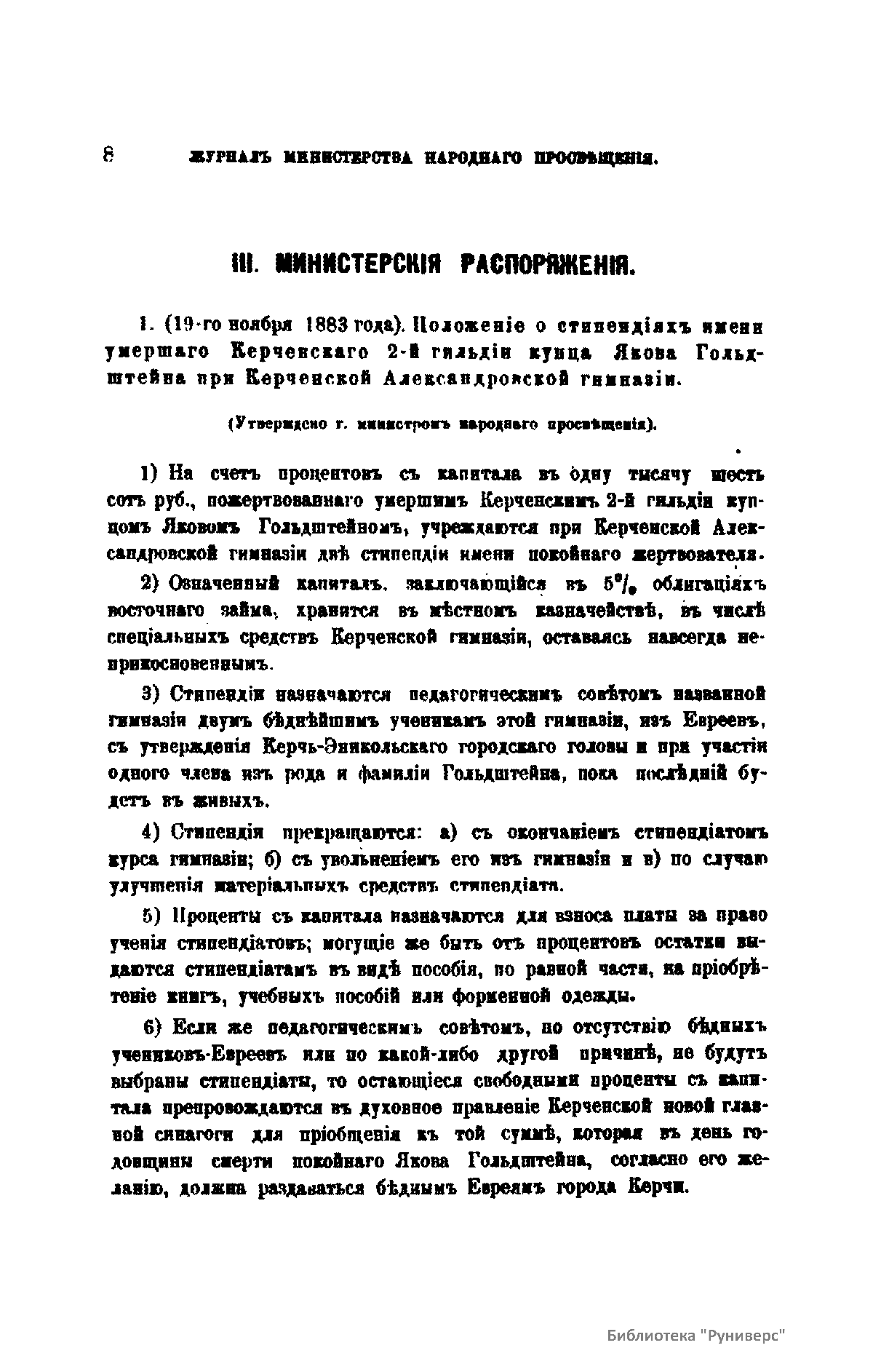 Журнал Министерства народного просвещения выходил с 1834-го по 1917 год. Официальный периодический журнал об успехах просвещения в России. Издатели журнала уверены в том, что «если для каждого человека необходим выход из грубой тьмы невежества и беспрерывное дальнейшее движение к свету, то для народов необходимо попечительное участие правительства в образовании. Только правительство имеет все средства знать и высоту успехов всемирного образования, и настоящие нужды Отечества».