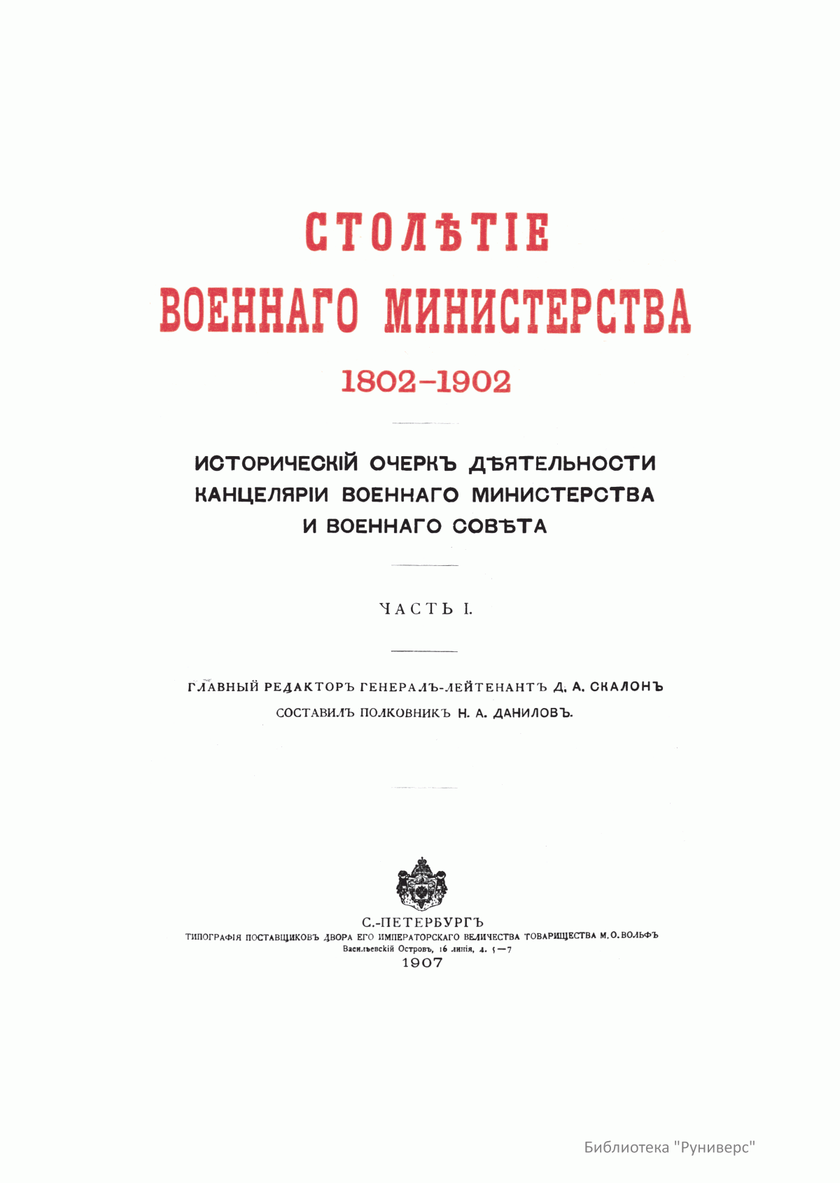 Столѣтiе военнаго министерства. 1802-1902. Историческiй очеркъ дѣятельности канцелярiи военнаго министерства и военнаго совѣта