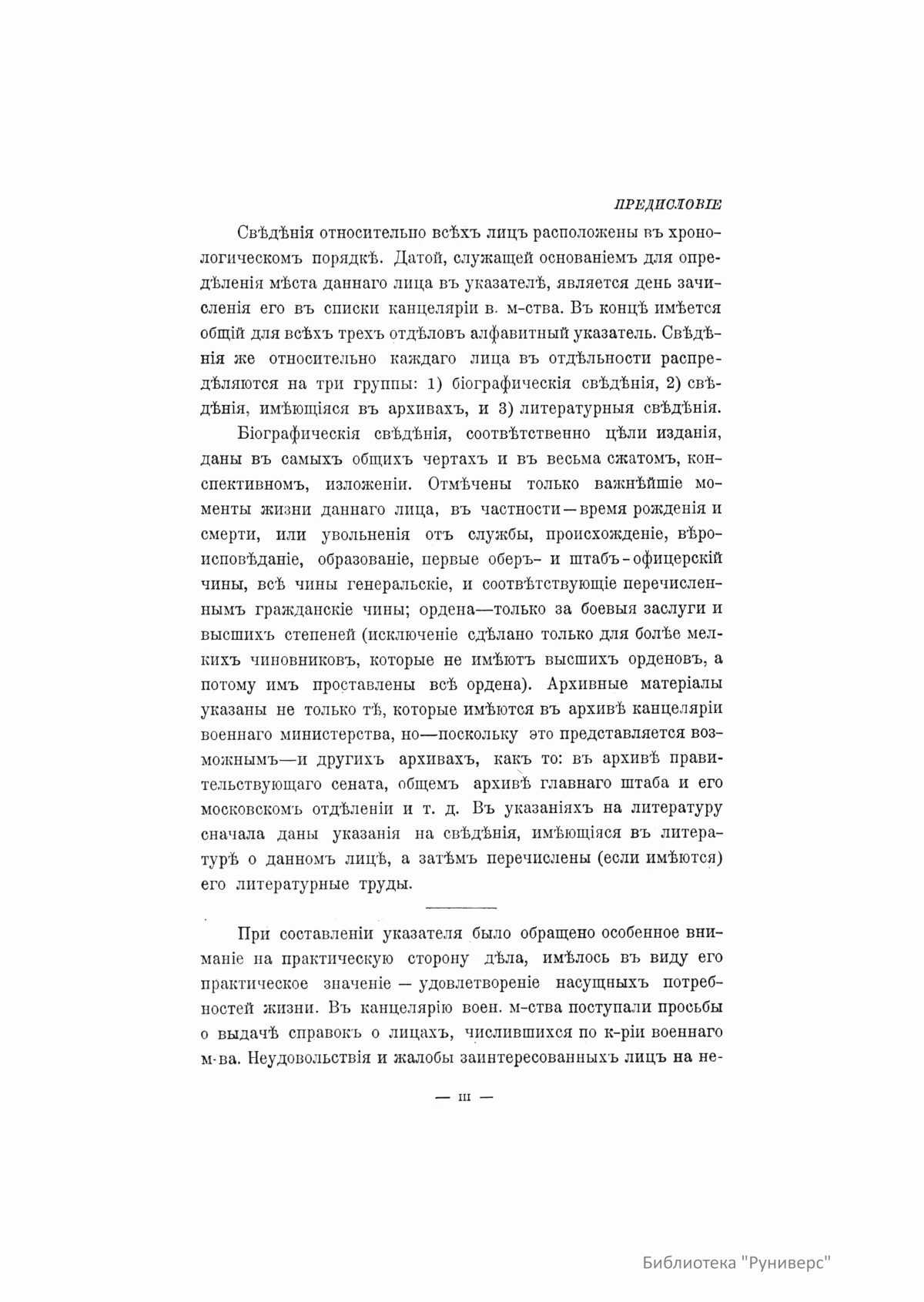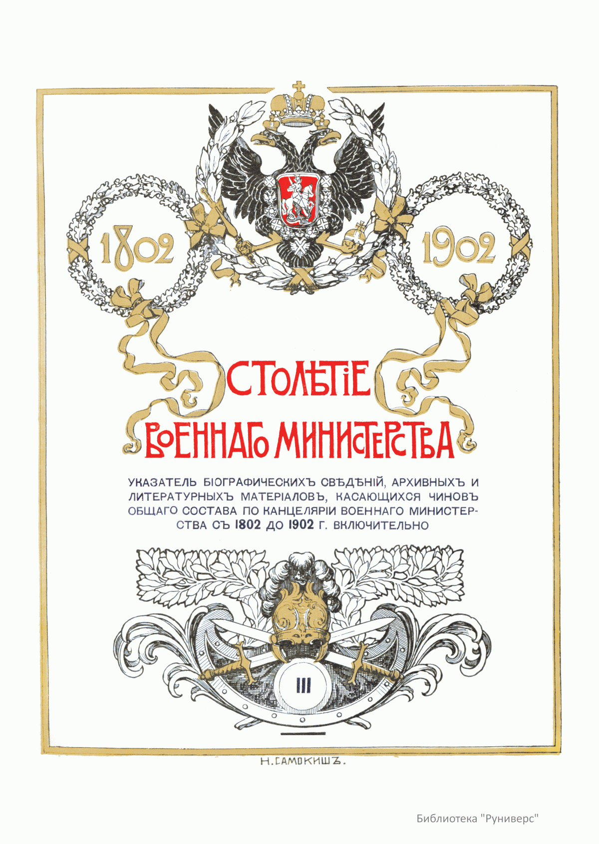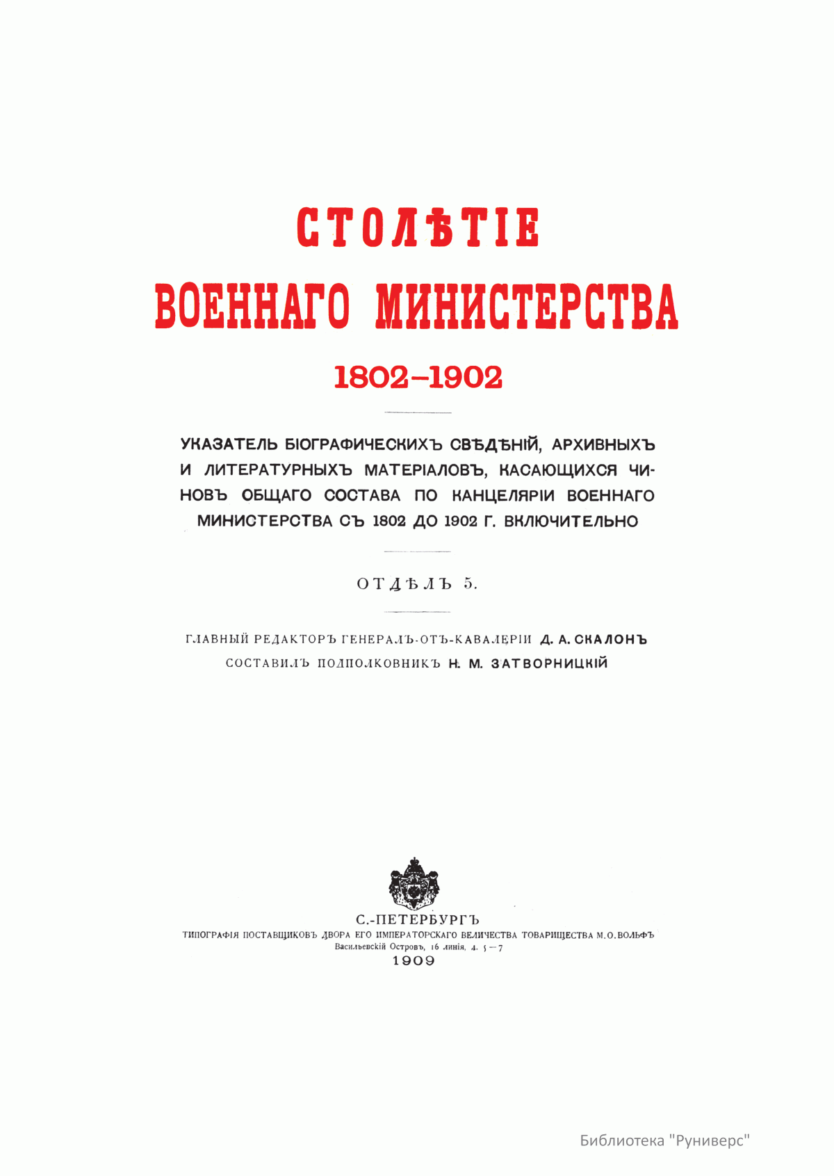 Столѣтiе военнаго министерства. 1802-1902. Указатель бiографическихъ свѣдѣнiй, архивныхъ и литературныхъ матерiаловъ, касающихся чиновъ общаго состава по канцелярiи военнаго министерства съ 1802 до 1902 г. включительно. Книга 1