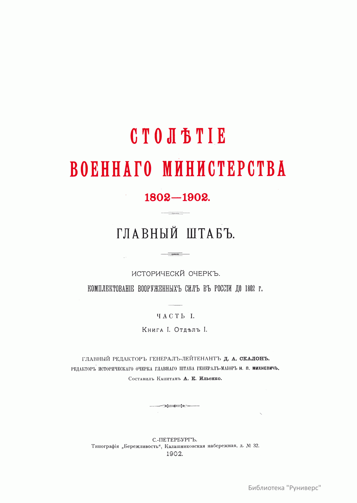 Столѣтiе военнаго министерства. 1802-1902. Главный штабъ. Историческiй очеркъ. Комплектованiе вооруженныхъ силъ въ Россiи до 1802 г.