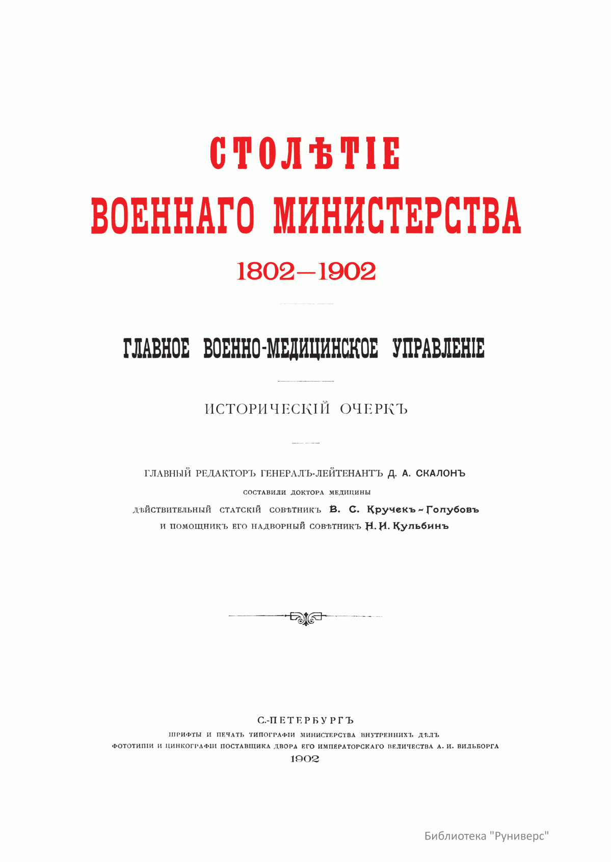 Столѣтiе военнаго министерства. 1802-1902. Главное военно-медицинское управленiе. Историческiй очеркъ