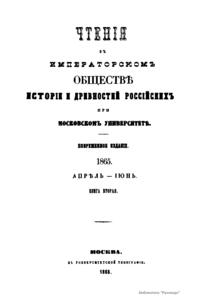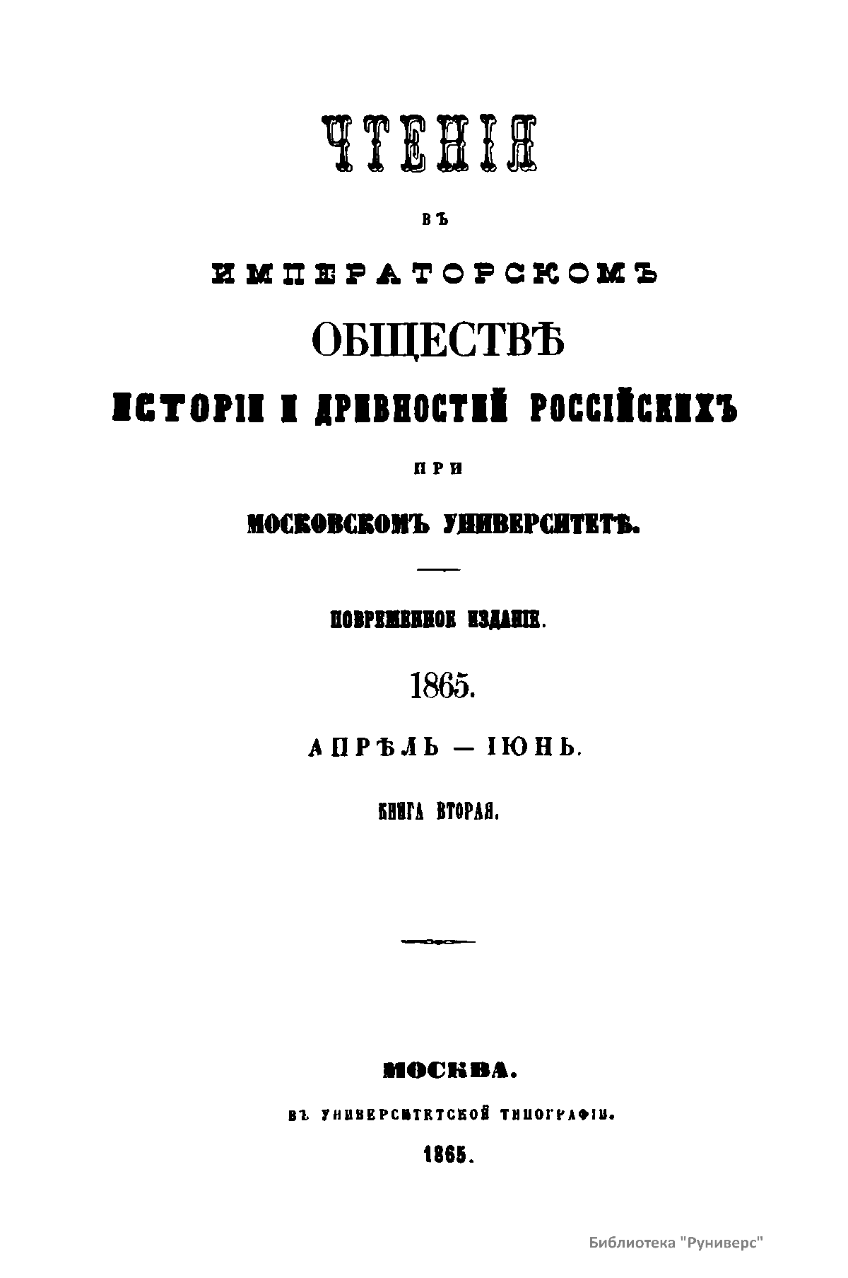 Чтенiя въ Императорскомъ Обществѣ Исторiи и Древностей Россiйскихъ при Московскомъ Университетѣ. 1865. Апрѣль-Iюнь. Книга вторая