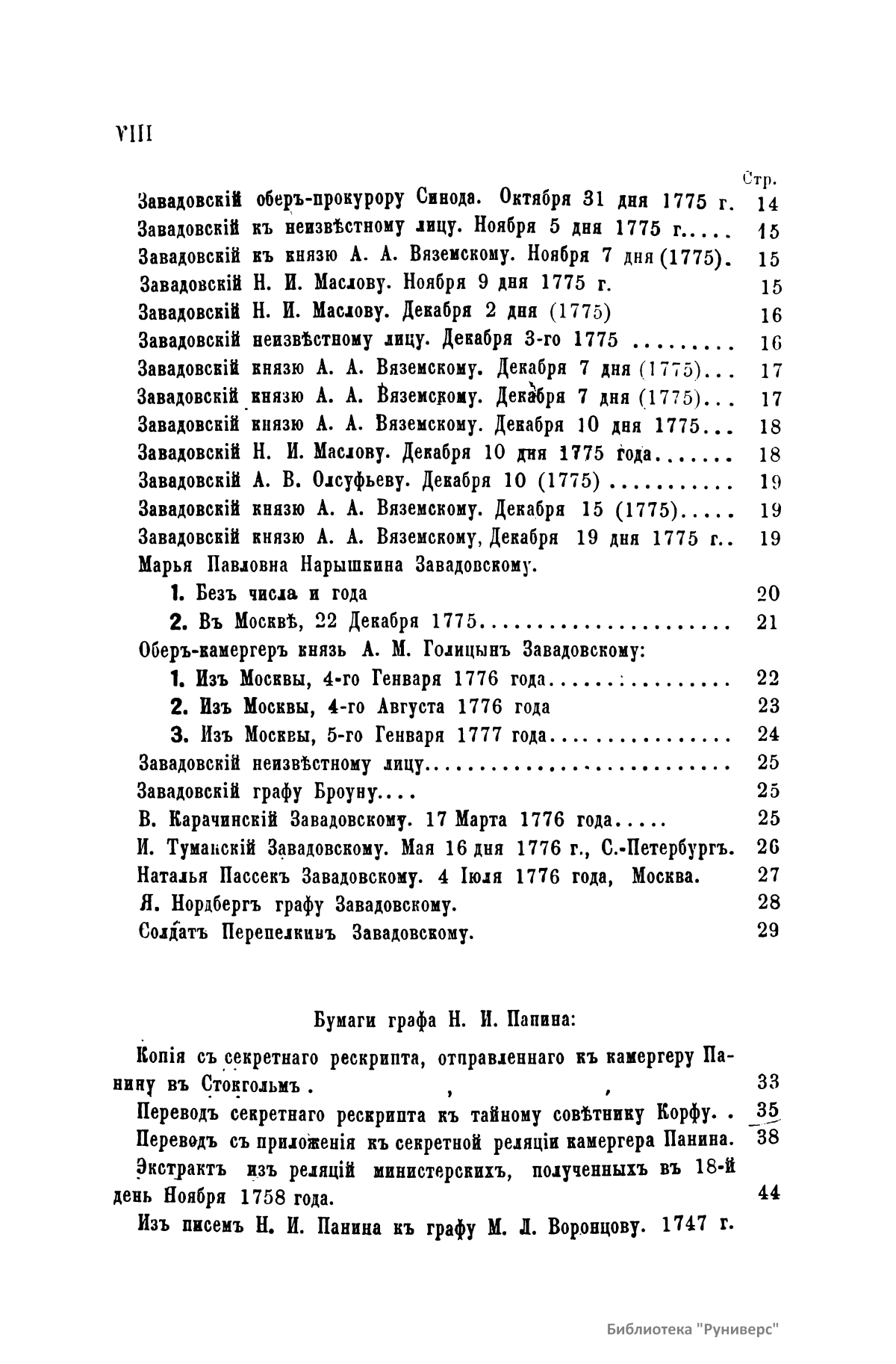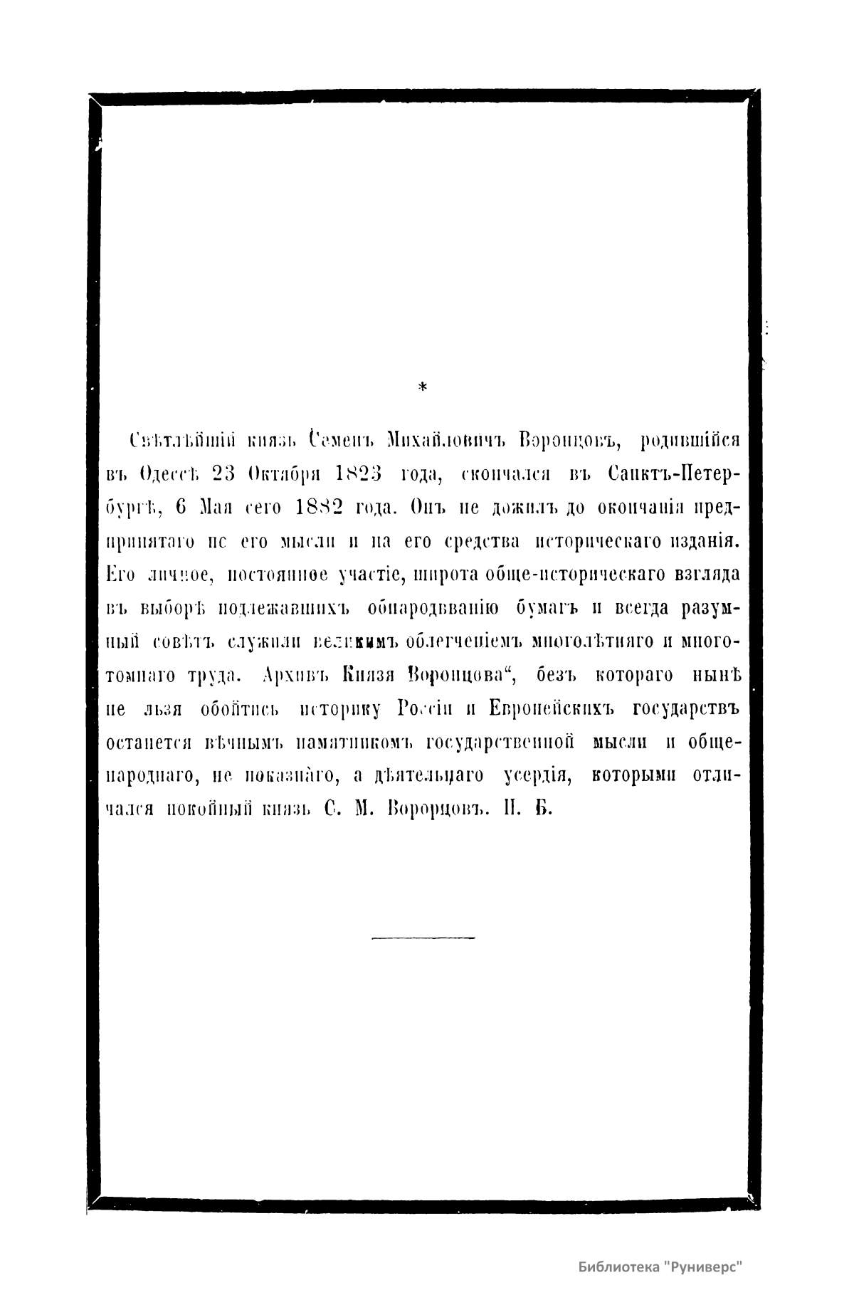 Издание представляет документы из архива графов (с 1845 г. князей) Воронцовых, крупных политических деятелей России XVIII и XIX вв.: Михаила Илларионовича (1714 – 1767) – канцлера при Елизавете Петровне; Романа Илларионовича (1707 – 1783); Александра Романовича (1741 – 1805) – канцлера в 1802 – 1804 гг.; Семена Романовича (1744 – 1832) – посла в Англии в 1785 – 1806 гг.; Михаила Семеновича (1782 – 1856) – фельдмаршала, наместника Кавказа в 1845 – 1853 гг. Архив издан в 40 тт. (1870 – 1895) под редакцией П. И. Бартенева. Содержит огромный материал по внешней политике, по управлению хозяйством Елизаветы Петровны (кн. 1), по делу Миниха и Бирона (кн. 2), о «чумном бунте» 1771 г. в Москве, о движении Е. И. Пугачева (кн. 16), о А. Н. Радищеве (кн. 5, 12, 24). Книга 21-я занята «Записками» Е. Р. Воронцовой (Дашковой). В книге 24-й – свыше 100 писем А. В. Суворова. Среди обширной переписки Воронцовых встречаются письма Вольтера, Д'Аламбера, Жозефа де Местра, Костюшки, Талейрана, Питта и др.