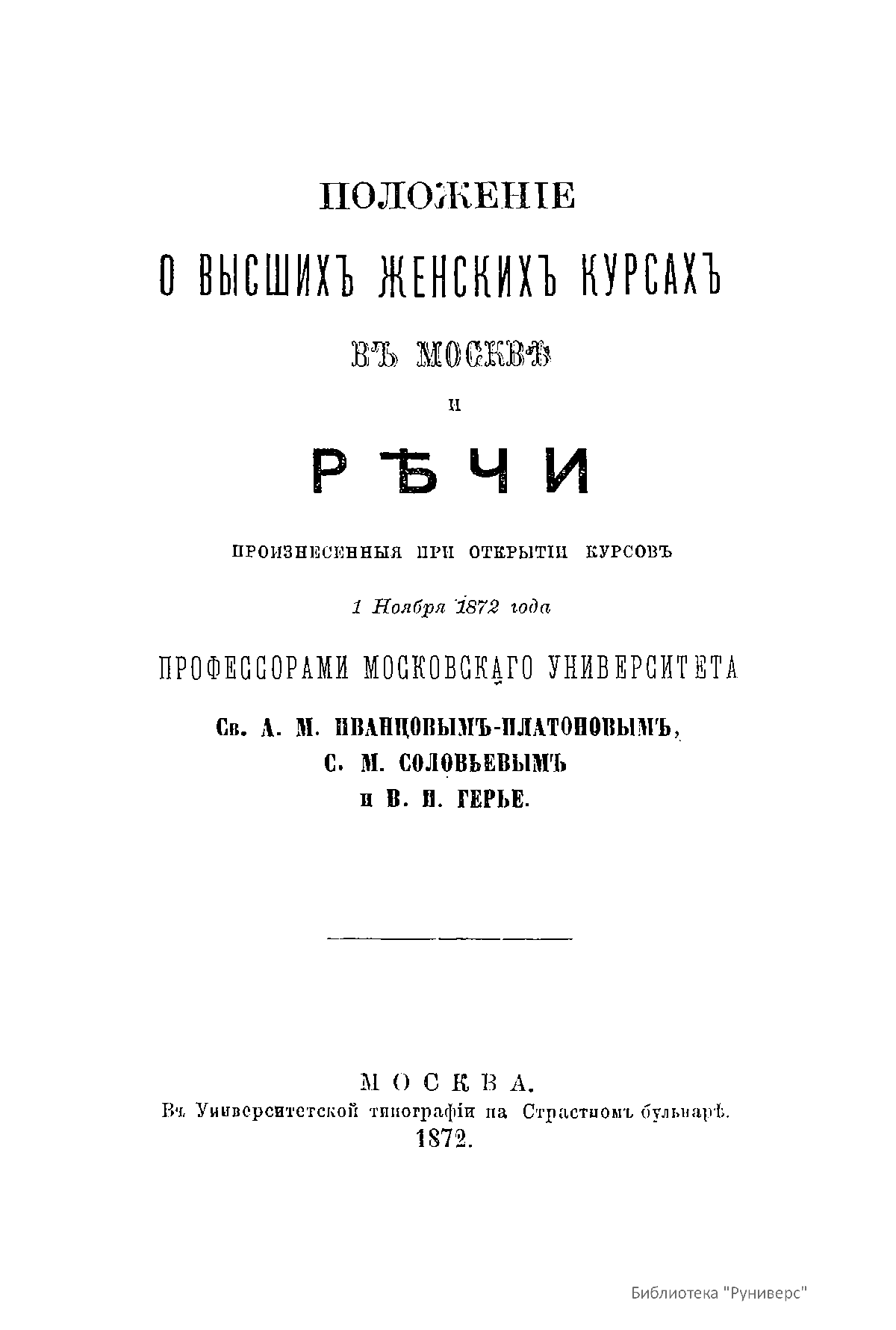 Положенiе о высшихъ женскихъ курсахъ въ Москвѣ и рѣчи произнесенныя при открытiи курсовъ 1 ноября 1872 года профессорами московскаго университета Св. А.М. Иванцовымъ-Платоновымъ, С.М. Соловьевымъ и В.И. Герье