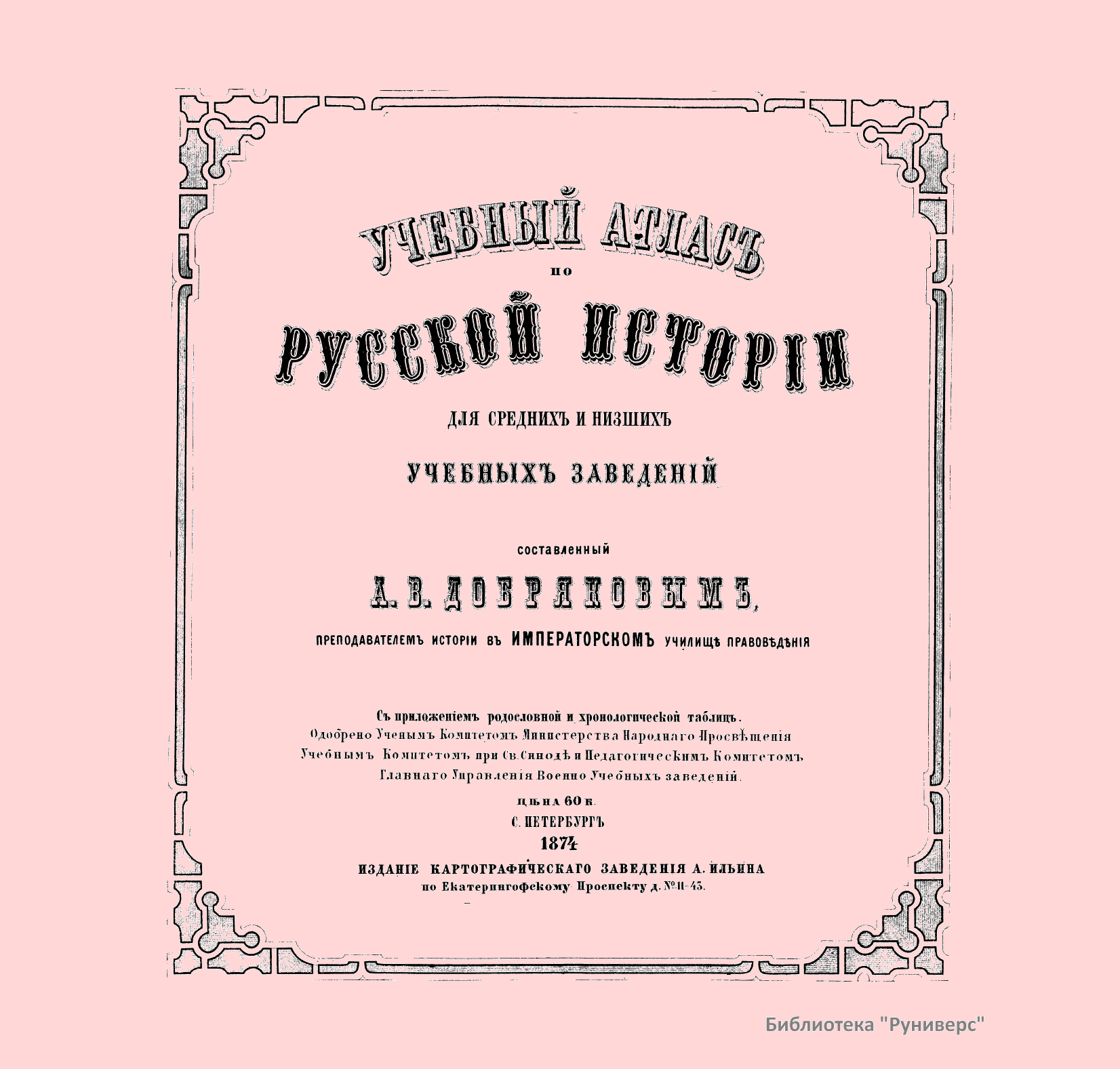 «Учебный Атлас по Русской Истории», Санкт-Петербург. 1874 г. Издание было осуществлено Картографическим заведением А. Ильина. Атлас состоит из 6 хромолитографированных карт-реконструкций, двух планов городов (Древнего Новгорода и Москвы XVII в.); двух таблиц — «Родословной» и «Хронологической».