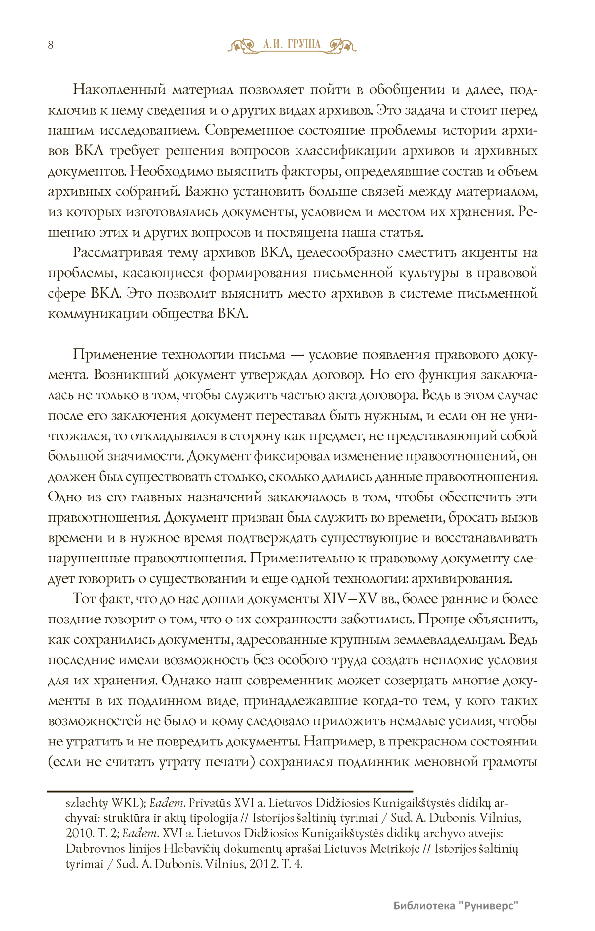 XIII–XVI столетия принципиально изменили карту Восточной Европы. Появление на ее просторах улуса Монгольской империи — Золотой Орды запустило процесс выдвижения новых политических центров. Одним из них стала Москва, но рядом с ней выросла другая Русь — Великое княжество Литовское и Русское, большая часть населения которого называлась «русскими» или «русинами» — но не считала себя «московитами». В средневековой Европе Литва сочетала воинственную центральную власть князей Гедиминовичей с широкими автономными правами отдельных земель и получила уникальный опыт конфессиональной и национальной терпимости. В номере собраны работы исследователей, с разных сторон изучав-ших своеобразие литовской модели государственности и факторы, способствовавшие дивергенции систем общественно-политического устройства двух крупнейших государств Восточной Европы — Великого княжества Литовского и Московского царства. Редакция «Исторического вестника» предоставила возможность высказать свои позиции не только российским историкам, но и их коллегам с Украины, Белоруссии, Литвы и Польши — тех стран, которые считают себя преемниками средневековой державы Гедиминовичей. А. Дубонис (Литва) показал, как грабительские походы литовских дружин превратились в завоевание соседних земель, и выделил две различные модели литовской экспансии — военную и мирную. Статья С.В. Полехова (Россия) посвящена восстанию в Смоленске в 1440 г. в контексте в целом успешного процесса интеграции Смоленщины: к началу XVI в. смоленские бояре, мещане и даже «черные люди» прочно ассоциировали себя с Великим княжеством Литовским. Е.В. Русина (Украина) попыталась оценить, как отвечает современная историография на вопрос: почему на руинах Древнерусской державы одновременно возникли столь непохожие друг на друга великие княжества Московское и Литовское, имевшие разную логику исторического развития? Д. Шульц и Р. Яворский (Польша) представили обзор трудов польских историков, посвященных ключевым в польско-литовских отношениях событиям — Кревскому акту 1385 г. и Люблинской унии 1569 г. А.И. Груша (Белоруссия) постарался обобщить сведения и выявить специфику (децентрализацию и подвижность) различных видов архивов Великого княжества Литовского, рассеянных ныне по архивохранилищам нескольких государств. А.В. Казаков (Белоруссия) проследил судьбу московского выходца XVI века И.Т. Юрлова, чей жизненный путь можно считать примером успешной интеграции эмигранта в социум Великого княжества Литовского в условиях благоприятного для москвичей «социокультурного климата» этого государства. В.А. Воронин (Белоруссия) оценил, как развивались отношения между католиками и православными в Великом княжестве в конце XIV — середине XVI в., и показал, что католической элите не удалось добиться абсолютного превосходства. До серьезных конфликтов на религиозной почве дело не доходило — в обществе были выработаны эффективные механизмы разрешения возникавших на конфессиональной почве противоречий. Д. Шульц (Польша) изучил влияние московско-литовских войн на процесс объединения Великого княжества с королевством Польским. Завершает номер рецензия С.В. Полехова на последнее издание документов Городельской унии Литвы и Польши 1413 г., посвящённая оценке реальных мер, направленных на интеграцию восточ