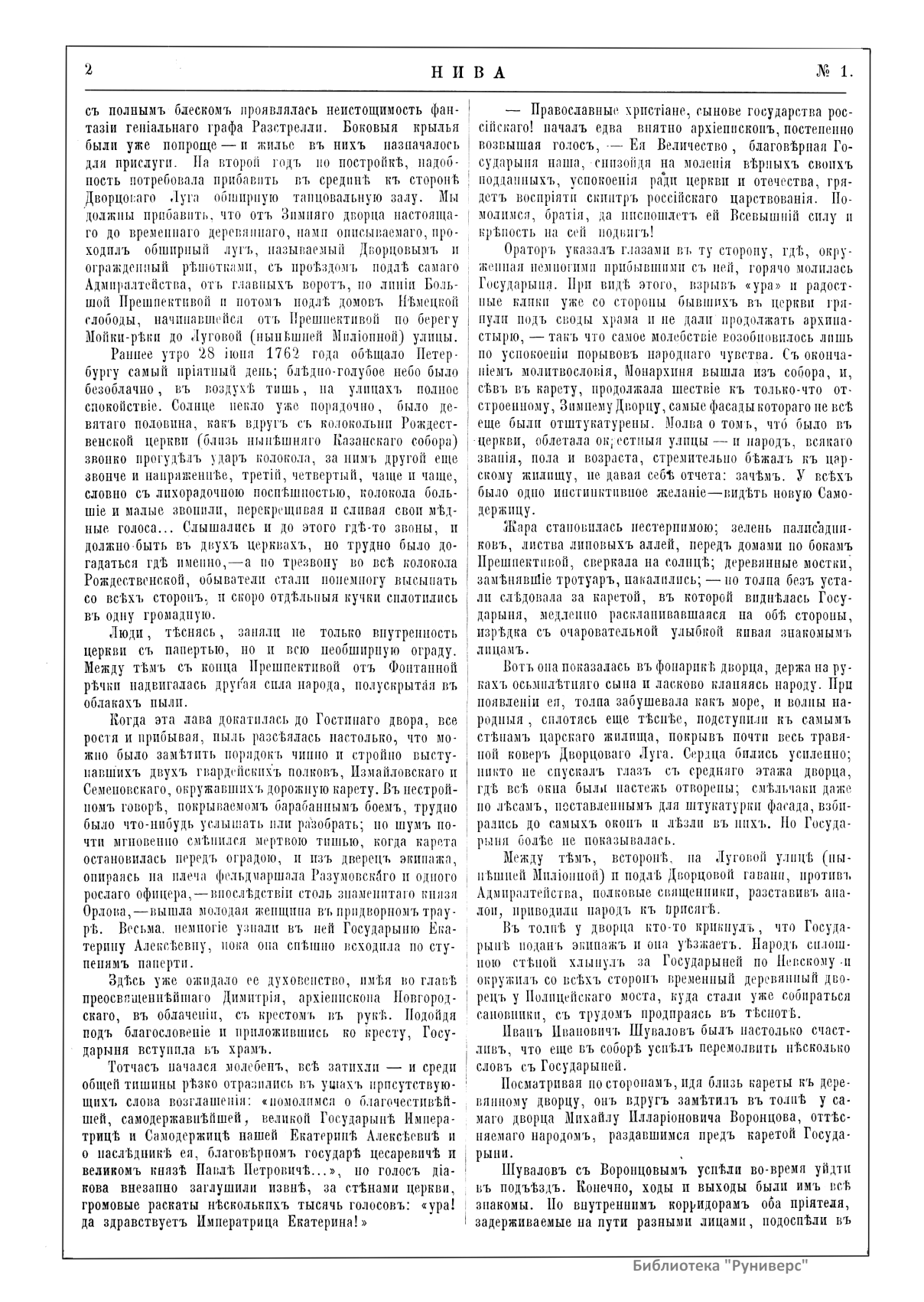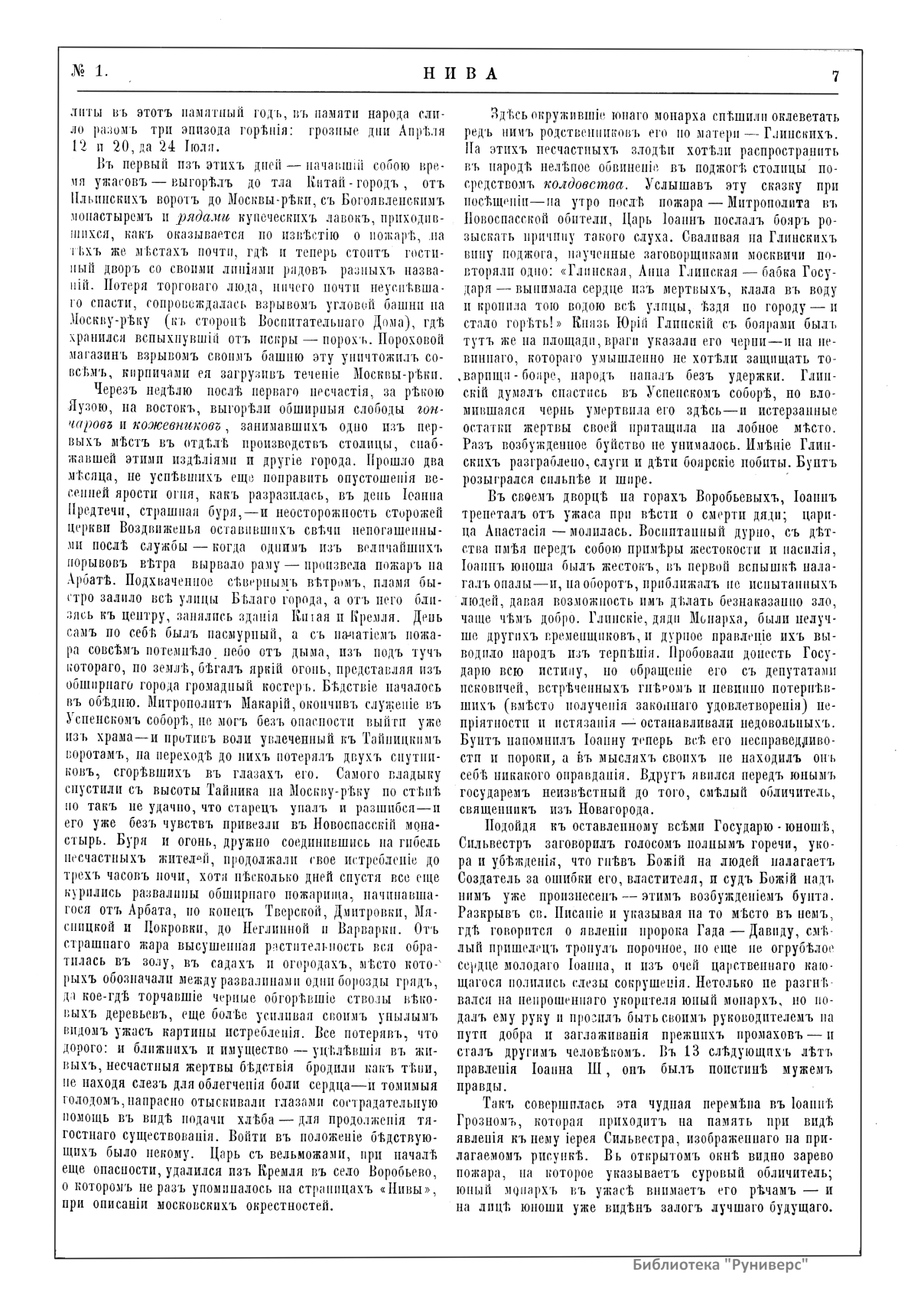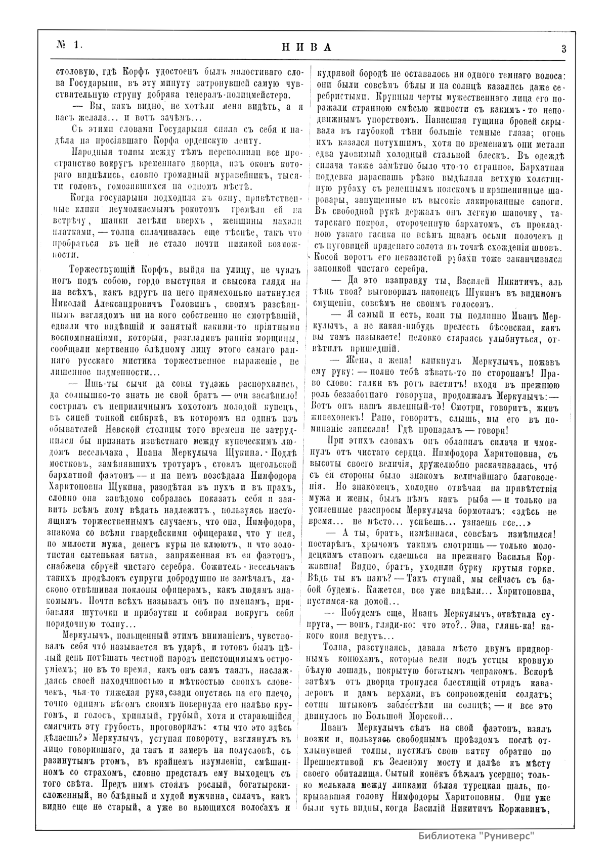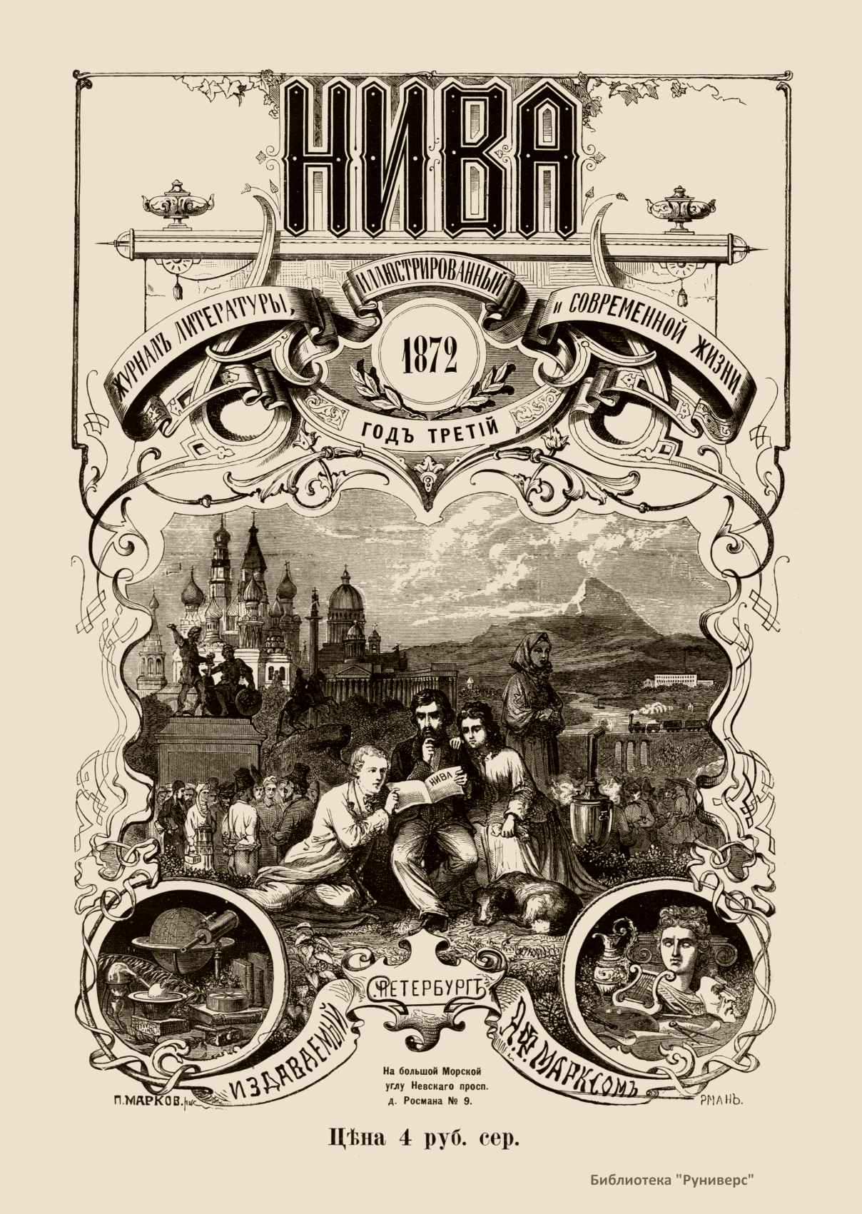 «Нива» — популярный еженедельный русский журнал с приложениями, издававшийся со второй половины XIX до начала XX века, носил подзаголовок «Журнал литературы, политики и современной жизни». Журнал был любимым детищем А. Ф. Маркса, возглавлявшего свое издательство вплоть до своей смерти в 1904 г. Позиционировалась «Нива» как иллюстрированный журнал для семейного чтения и был ориентирован, главным образом, на обывателя. В журнале публиковались литературные произведения, исторические, научно-популярные очерки, репродукции и гравюры картин современных художников. Материалы политического и общественного содержания также сопровождались многочисленными иллюстрациями. Среди известных литераторов, печатавшихся в журнале, были А. К. Толстой, Ф. И. Тютчев, Л. Н. Толстой, А. А. Фет, А. П. Чехов, Максим Горький, Корней Чуковский, Анна Ахматова, Иван Бунин и многие другие. Благодаря «Ниве» сочинения многих современных авторов добрались до самых отдаленных областей России.