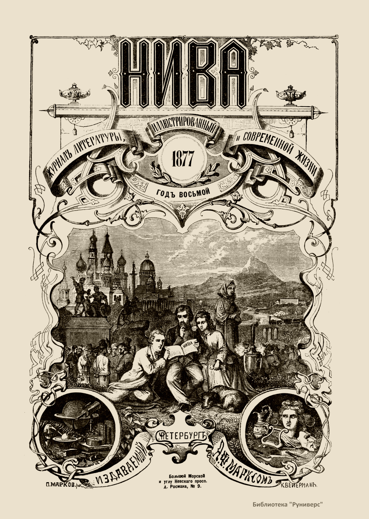 «Нива» — популярный еженедельный русский журнал с приложениями, издававшийся со второй половины XIX до начала XX века, носил подзаголовок «Журнал литературы, политики и современной жизни». Журнал был любимым детищем А. Ф. Маркса, возглавлявшего свое издательство вплоть до своей смерти в 1904 г. Позиционировалась «Нива» как иллюстрированный журнал для семейного чтения и был ориентирован, главным образом, на обывателя. В журнале публиковались литературные произведения, исторические, научно-популярные очерки, репродукции и гравюры картин современных художников. Материалы политического и общественного содержания также сопровождались многочисленными иллюстрациями. Среди известных литераторов, печатавшихся в журнале, были А. К. Толстой, Ф. И. Тютчев, Л. Н. Толстой, А. А. Фет, А. П. Чехов, Максим Горький, Корней Чуковский, Анна Ахматова, Иван Бунин и многие другие. Благодаря «Ниве» сочинения многих современных авторов добрались до самых отдаленных областей России.