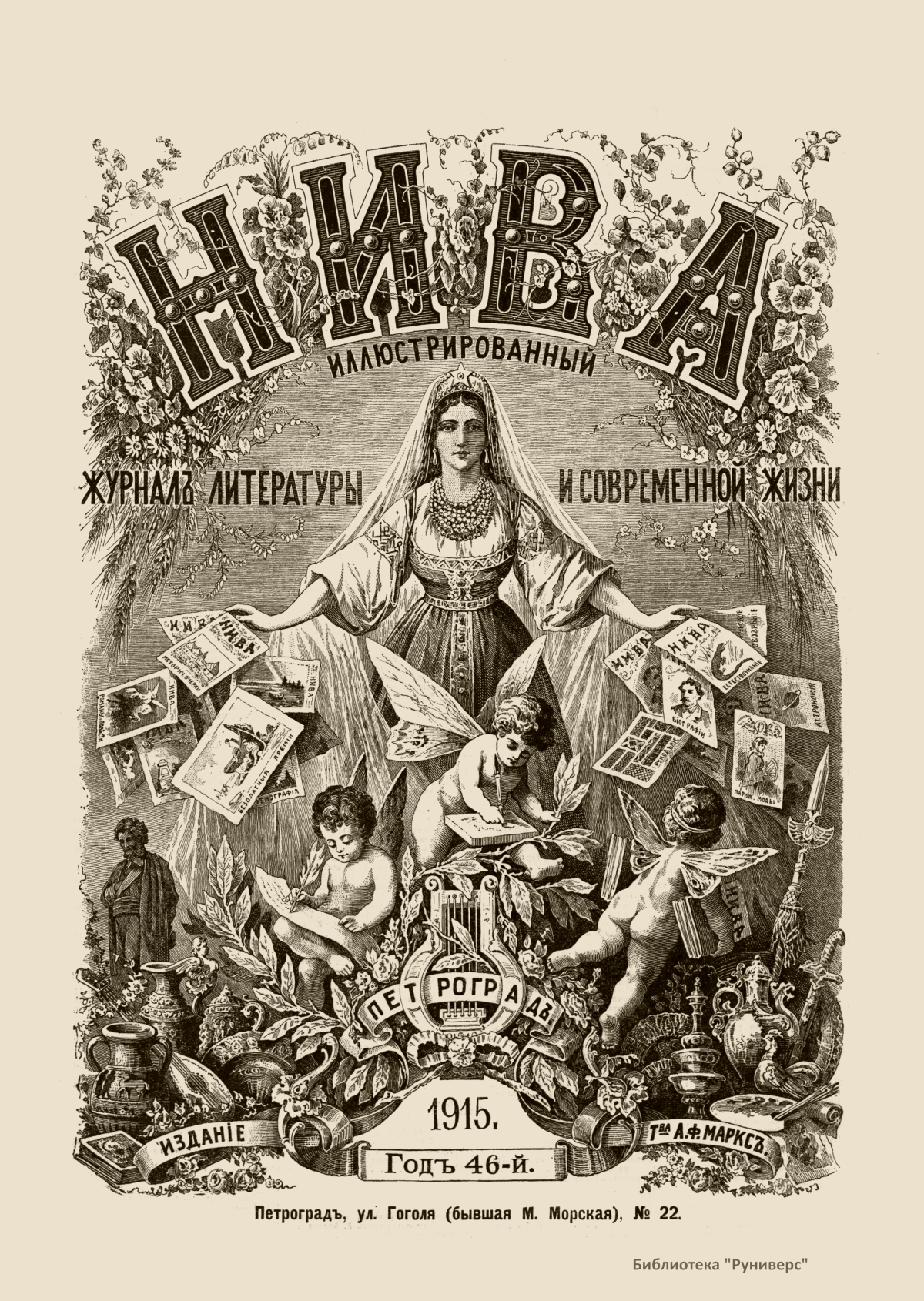 «Нива» — популярный еженедельный русский журнал с приложениями, издававшийся со второй половины XIX до начала XX века, носил подзаголовок «Журнал литературы, политики и современной жизни». Журнал был любимым детищем А. Ф. Маркса, возглавлявшего свое издательство вплоть до своей смерти в 1904 г. Позиционировалась «Нива» как иллюстрированный журнал для семейного чтения и был ориентирован, главным образом, на обывателя. В журнале публиковались литературные произведения, исторические, научно-популярные очерки, репродукции и гравюры картин современных художников. Материалы политического и общественного содержания также сопровождались многочисленными иллюстрациями. Среди известных литераторов, печатавшихся в журнале, были А. К. Толстой, Ф. И. Тютчев, Л. Н. Толстой, А. А. Фет, А. П. Чехов, Максим Горький, Корней Чуковский, Анна Ахматова, Иван Бунин и многие другие. Благодаря «Ниве» сочинения многих современных авторов добрались до самых отдаленных областей России.