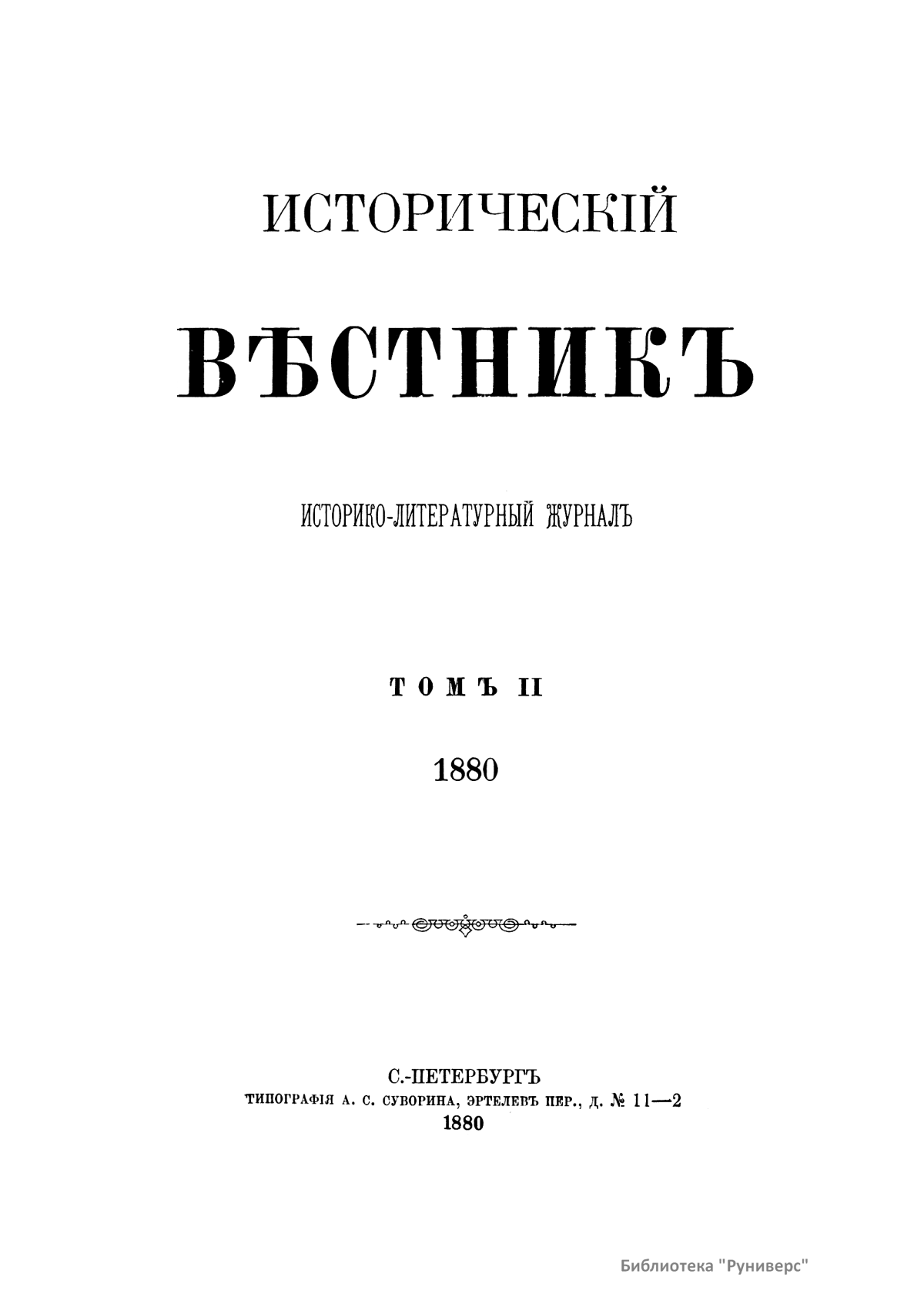 «Исторический вестник» - русский ежемесячный историко-литературный журнал. Издавался в Санкт-Петербурге с 1880-го по 1917 г. Журнал был основан А.С. Сувориным и С.Н. Шубинским с целью «знакомить читателей в живой, общедоступной форме с современным состоянием исторической науки и литературы в России и Европе». Вышло 150 тт. Каждый том состоял из трёх ежемесячных выпусков, имел свою нумерацию страниц, оглавление, список иллюстраций. Журнал приобрёл устойчивую популярность среди читателей, заняв прочное место в «триумвирате» русских исторических журналов наряду с «Русским архивом» и «Русской стариной». опережая их по количеству подписчиков. Отличием «Исторического вестника» было то, что он не помещал на своих страницах необработанных, сырых материалов. С другой стороны, журнал приближался по своему типу к журналам общелитературного образца, сочетая в себе коммерческий успех и доступное изложение материала.