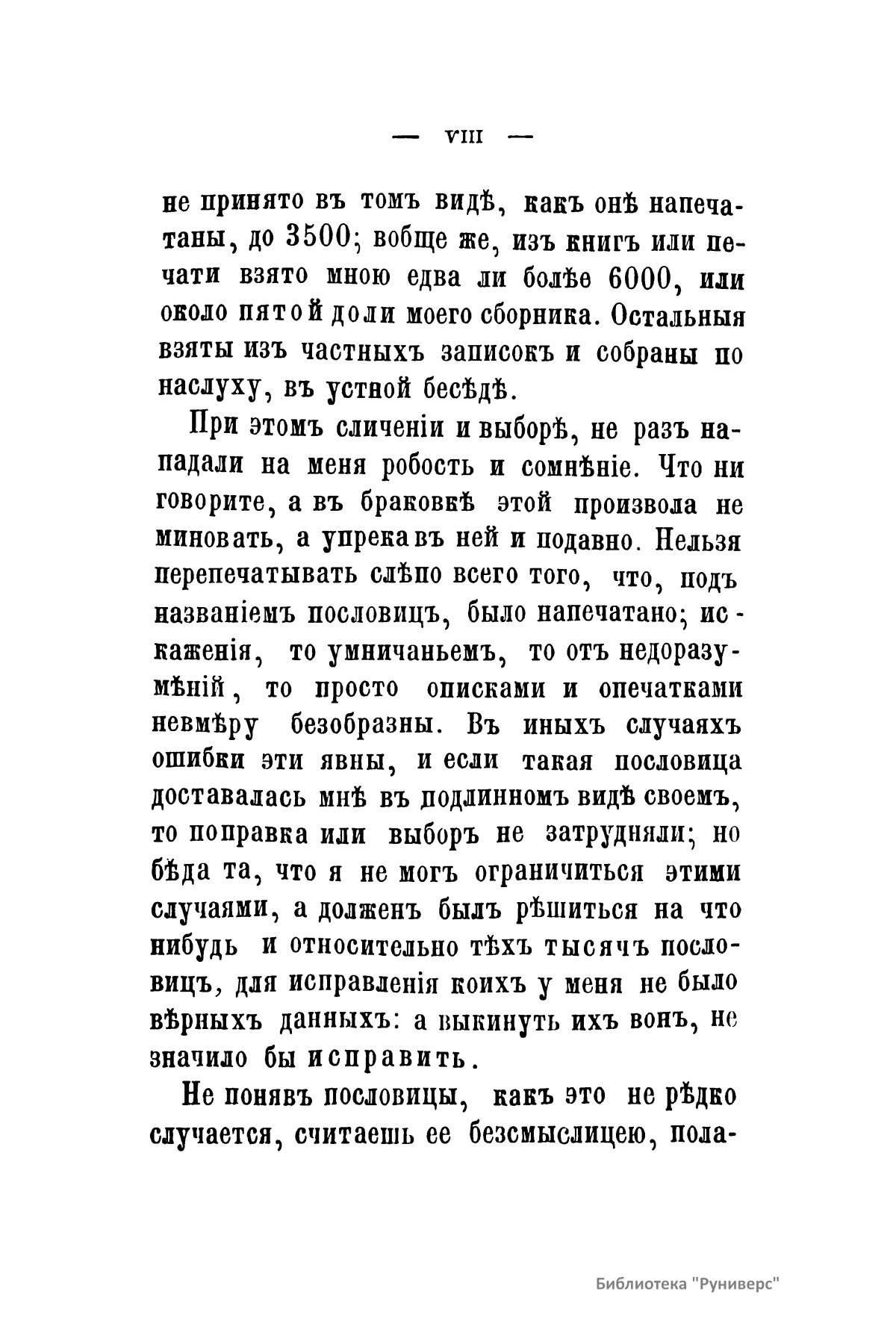 В этот сборник вошли кроме пословиц пословичные изречения, поговорки, присловья, скороговорки, прибаутки, загадки, поверья, приметы, суеверья и много речений, условно вошедшие в употребление. «В этом сборнике должны сойтись народная мудрость с народной глупостью, ум с пошлостью, добро со злом, истина с ложью. Человек должен явиться здесь таким, каков он вообще, на всем земном шаре, и каков он в частности, в нашем народе. Что худо, то бегай, что добро, тому следуй, но не прячь, не скрывай ни добра, ни худа, а покажи, что есть... Сборник пословиц – это свод народной опытной премудрости. Это стоны и вздохи, плач и рыданье, радость и веселие, горе и утешение в лицах. Это цвет народного ума, самобытной стати, это житейская народная правда, своего рода судебник, никем не судимый… Что не дошло до народа не касалось житья-бытья его, то не шевелило ни ума, ни сердца его, и того в пословицах нет; что впуталось добром, либо лихом в быт его, то найдете и в пословице».