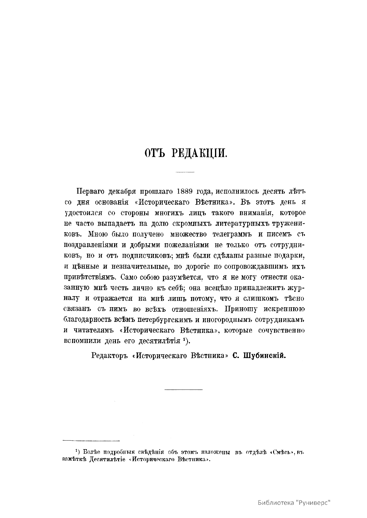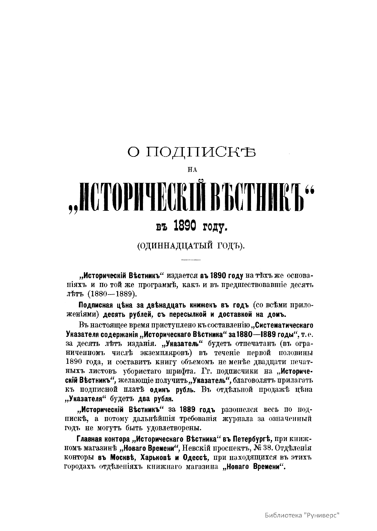 «Исторический вестник» - русский ежемесячный историко-литературный журнал. Издавался в Санкт-Петербурге с 1880-го по 1917 г. Журнал был основан А.С. Сувориным и С.Н. Шубинским с целью «знакомить читателей в живой, общедоступной форме с современным состоянием исторической науки и литературы в России и Европе». Вышло 150 тт. Каждый том состоял из трёх ежемесячных выпусков, имел свою нумерацию страниц, оглавление, список иллюстраций. Журнал приобрёл устойчивую популярность среди читателей, заняв прочное место в «триумвирате» русских исторических журналов наряду с «Русским архивом» и «Русской стариной». опережая их по количеству подписчиков. Отличием «Исторического вестника» было то, что он не помещал на своих страницах необработанных, сырых материалов. С другой стороны, журнал приближался по своему типу к журналам общелитературного образца, сочетая в себе коммерческий успех и доступное изложение материала.